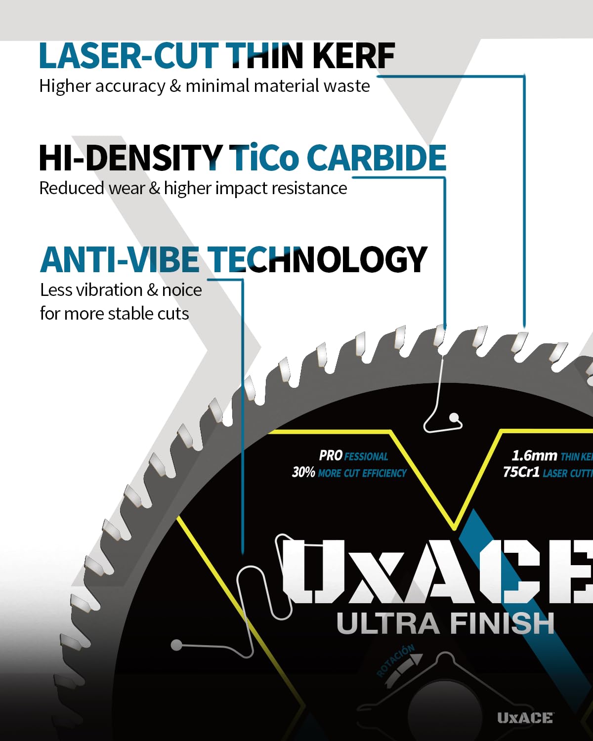 - 【WIDE RANGE OF APPLICATION】UXACE professional wood cutting circular saw blade delivers extraordinary performance and maximum lifespan. With thin kerf design, hi-density TiCo carbide and 75Cr1 hardened steel body manufactured, this is the blade suitable for anyone looking for smooth and clean cutting experience on softwood, hardwood, plywood, pressure treated wood, MDF, OSB, lumber and laminated using a corded or cordless circular saw