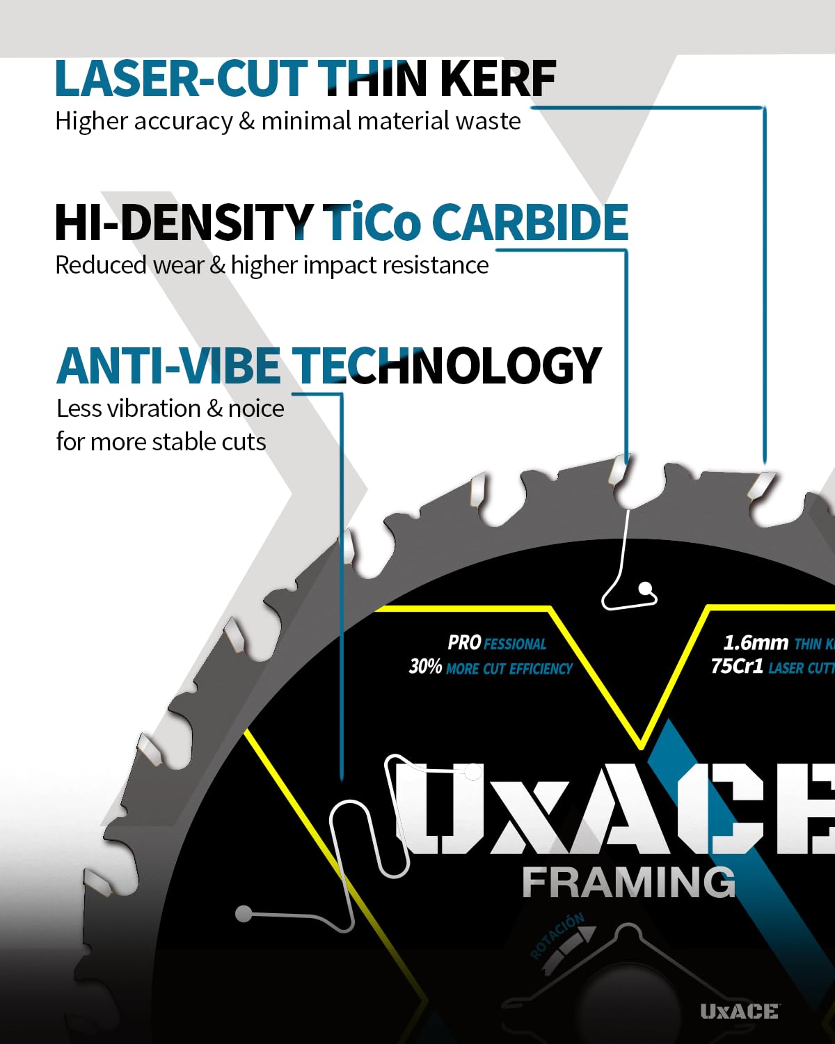 - 【WIDE RANGE OF APPLICATION】UXACE professional wood cutting circular saw blade delivers extraordinary performance and maximum lifespan. With thin kerf design, hi-density TiCo carbide and 75Cr1 hardened steel body manufactured, this is the blade suitable for anyone looking for smooth and clean cutting experience on softwood, hardwood, plywood, pressure treated wood, MDF, OSB, lumber and laminated using a corded or cordless circular saw