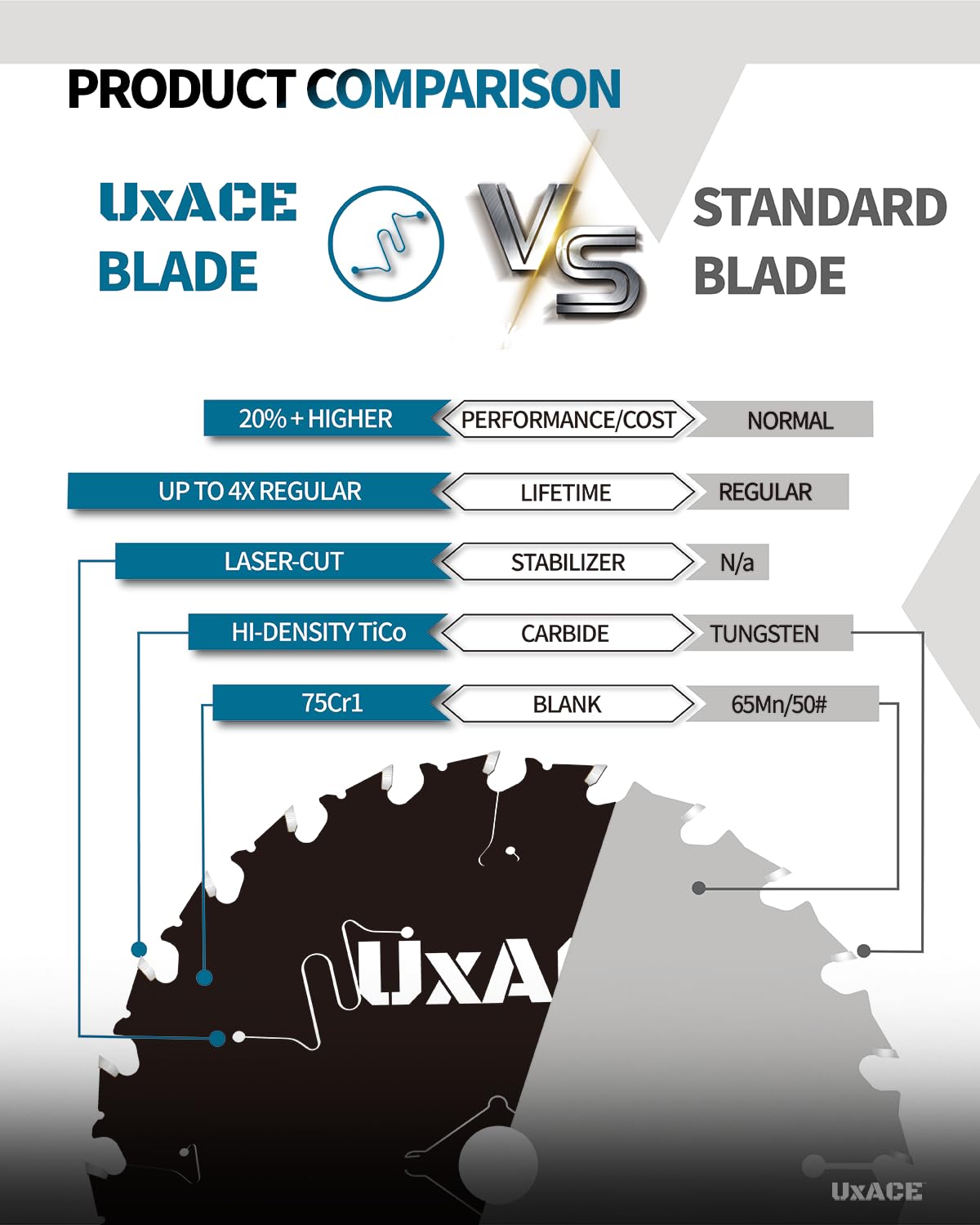 - 【WIDE RANGE OF APPLICATION】UXACE professional wood cutting circular saw blade delivers extraordinary performance and maximum lifespan. With thin kerf design, hi-density TiCo carbide and 75Cr1 hardened steel body manufactured, this is the blade suitable for anyone looking for smooth and clean cutting experience on softwood, hardwood, plywood, pressure treated wood, MDF, OSB, lumber and laminated using a corded or cordless circular sawProfessional grade TiCo hi-density carbide
