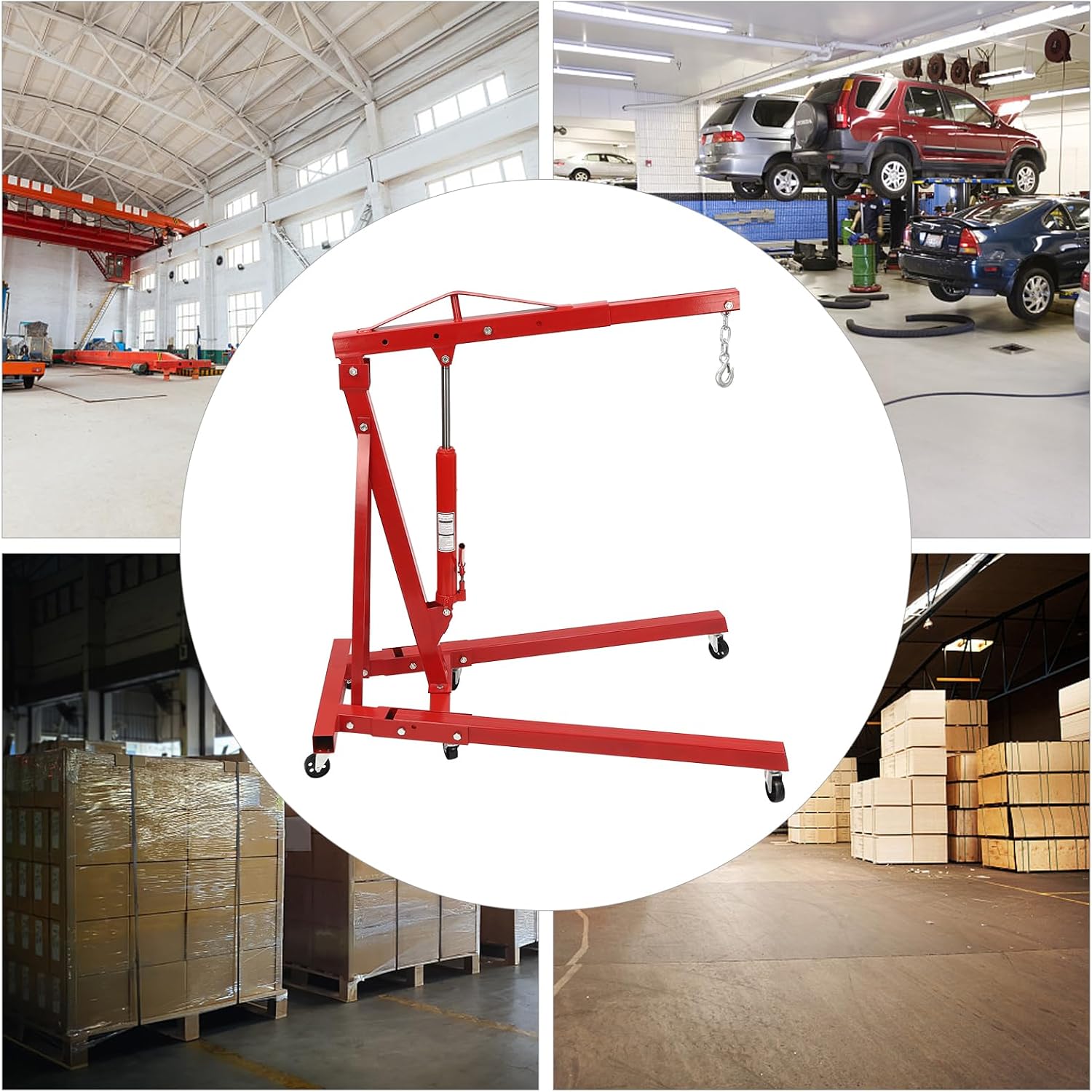 2 Ton(4409lbs) Folding Engine Hoist Heavy Duty Carbon Steel Hydraulic Shop Engine Crane Cherry Picker Shop Crane Hoist Lift with 6 Iron Caster Wheels for Car Fixing Workshop Garage (Red)