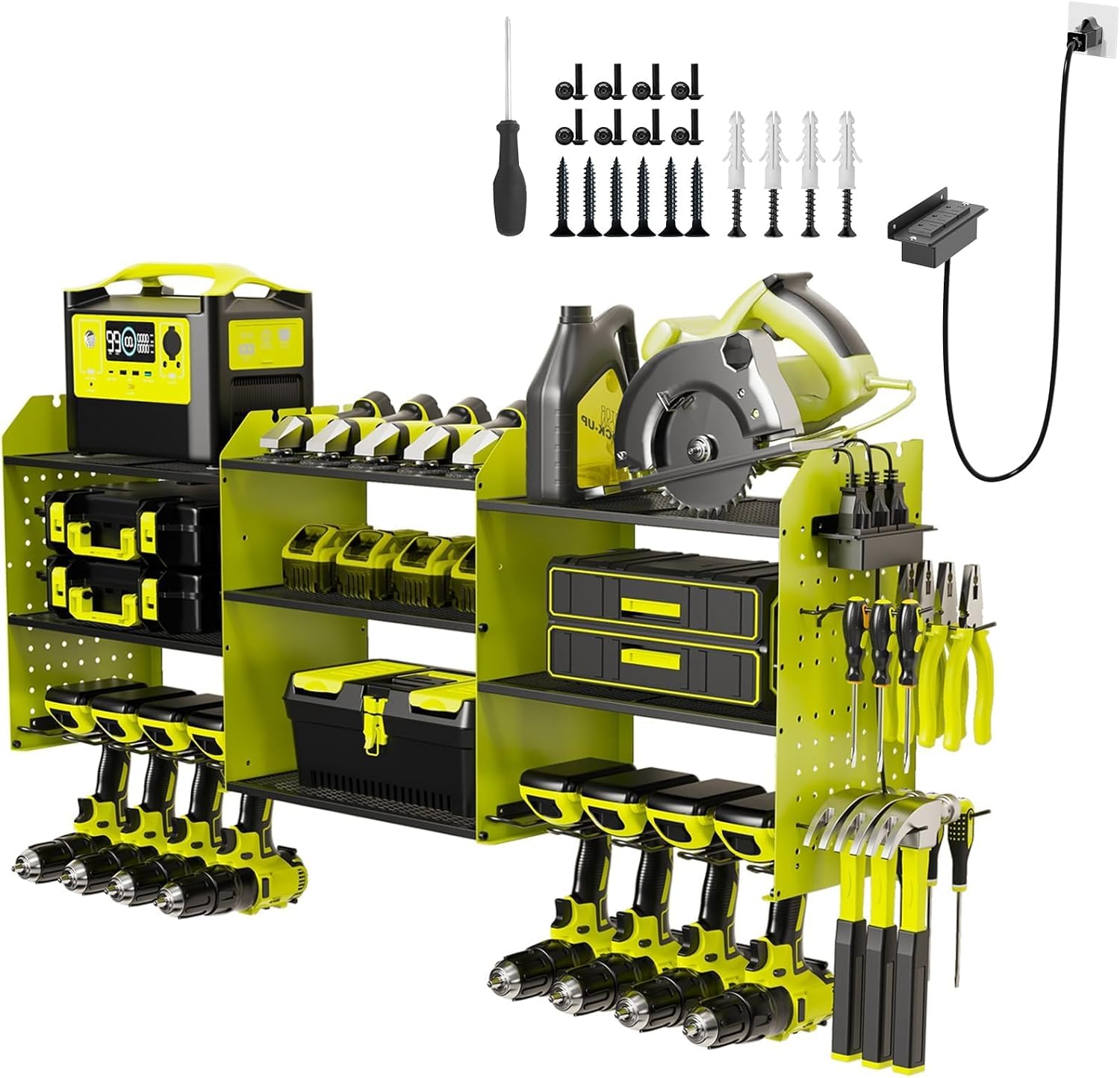 - 【EXCELLENT MATERIAL】This power tool organizer is made of thickened, heavy-duty steel metal with a durable black powder coat finish to prevent rust, it will stay in brand new condition whether it's in a wet basement or dusty and humid garage, ensuring that the tool rack will have a lifetime of service life and become a reliable companion in your workplace.