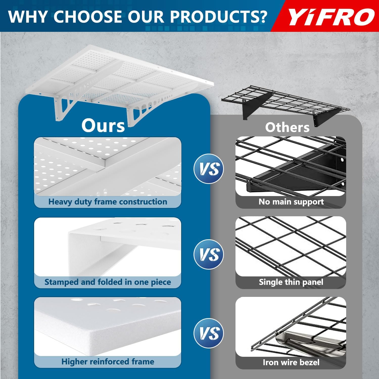 - HEAVY DUTY CONSTRUCTION: YIFRO garage wall shelving takes its cues from architectural frame construction, with a 2x3 ft individual bracket load capacity of 250 lbs. and a total of 1000 lbs. for 4 shelves, which makes it easy to store most of the items in your garage.