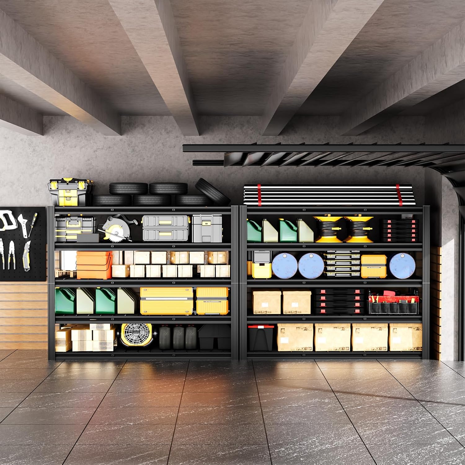- 3000LBS Garage Shelving: The garage storage shelves frame, crafted from sturdy steel, supports up to 600 lbs per shelf (evenly distributed) and a total capacity of 3000 lbs. Conveniently store toolboxes, tires, or any heavy items. Its 60"W x 24"D x 72"H design offers easy access and a sleek, professional look that complements any environment.