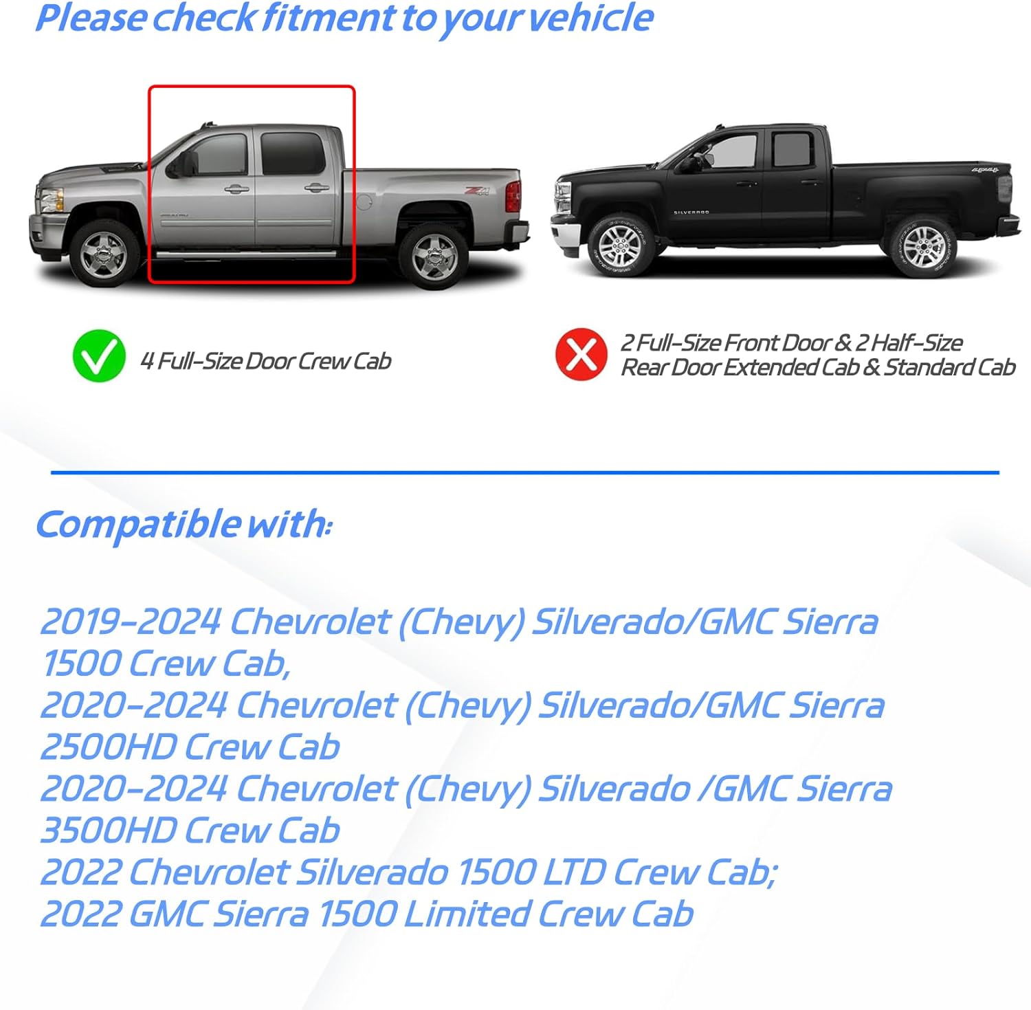 - : Vehicle Service Type Fit for 2019-2025 Chevrolet Silverado 1500 Crew Cab; 2020-2025 Chevrolet Silverado 2500 HD Crew Cab; 2020-2025 Chevrolet Silverado 3500 HD Crew Cab; 2019-2025 GMC Sierra 1500 Crew Cab; 2020-2025 GMC Sierra 2500 HD Crew Cab; 2020-2025 GMC Sierra 3500 HD Crew Cab; 2022 Chevrolet Silverado 1500 LTD Crew Cab; 2022 GMC Sierra 1500 Limited Crew Cab (ONLY for 4 FULL-SIZE Doors) Fit for 2019-2025 Chevrolet Silverado 1500 Crew Cab; 2020-2025 Chevrolet Silverado 2500β¦ See more