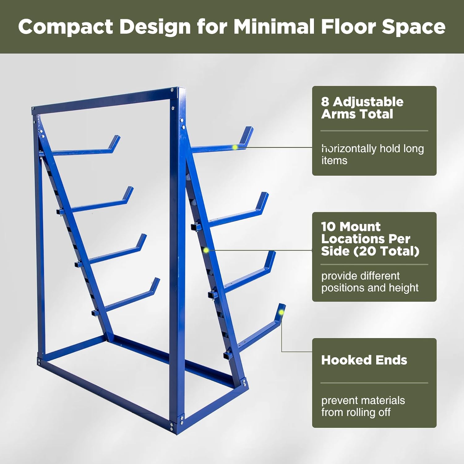 - Premium Material: An adjustable bar and pipe storage rack is a great asset for work place organization and efficiency. This unit features a sturdy steel construction with a blue powder-coated finish, the rack and arms consistently hold heavy material.