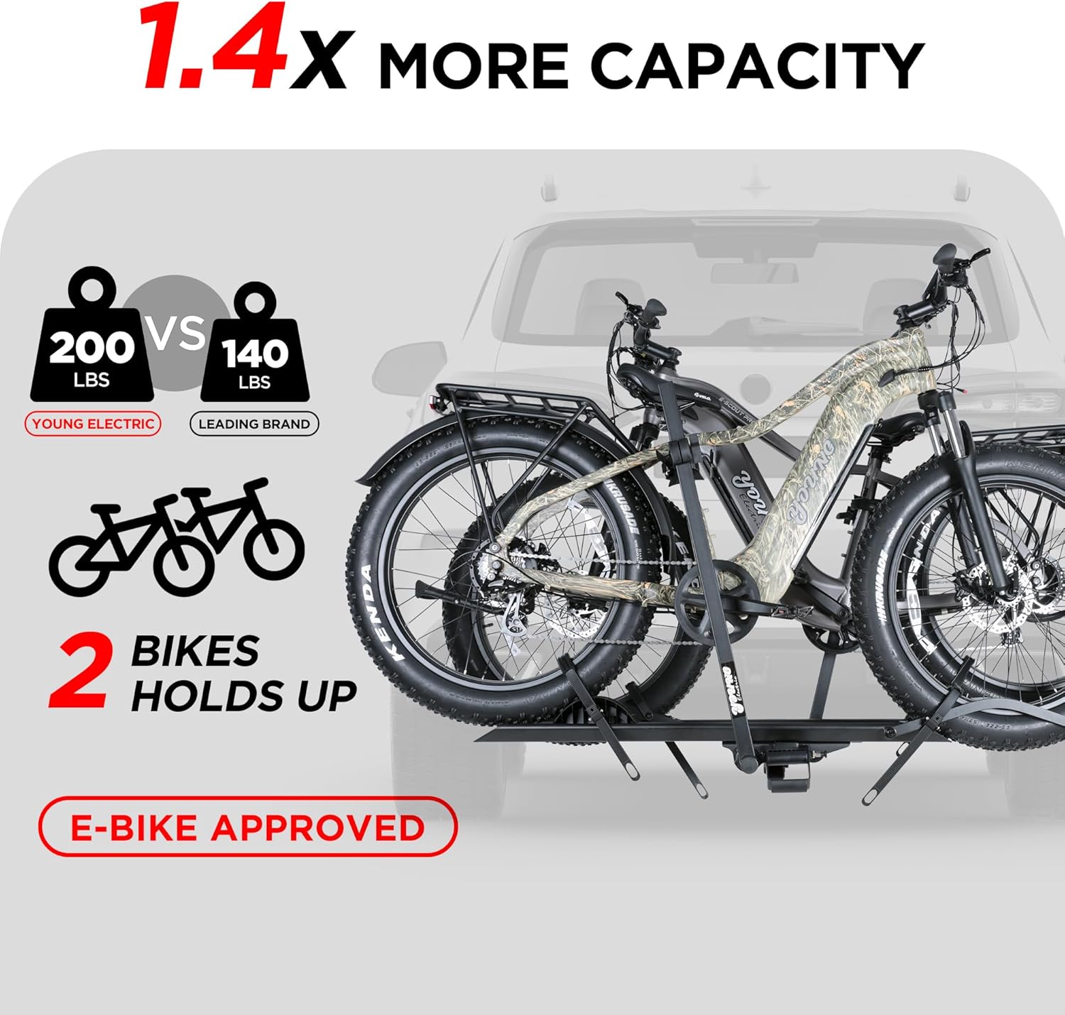 - 200 LB TOTAL CAPACITY: Easily transports up to 100 pounds per bike. Universal tire holders and wheel straps are compatible with e-bikes, mountain bikes, road bikes with up to 5” fat tires.