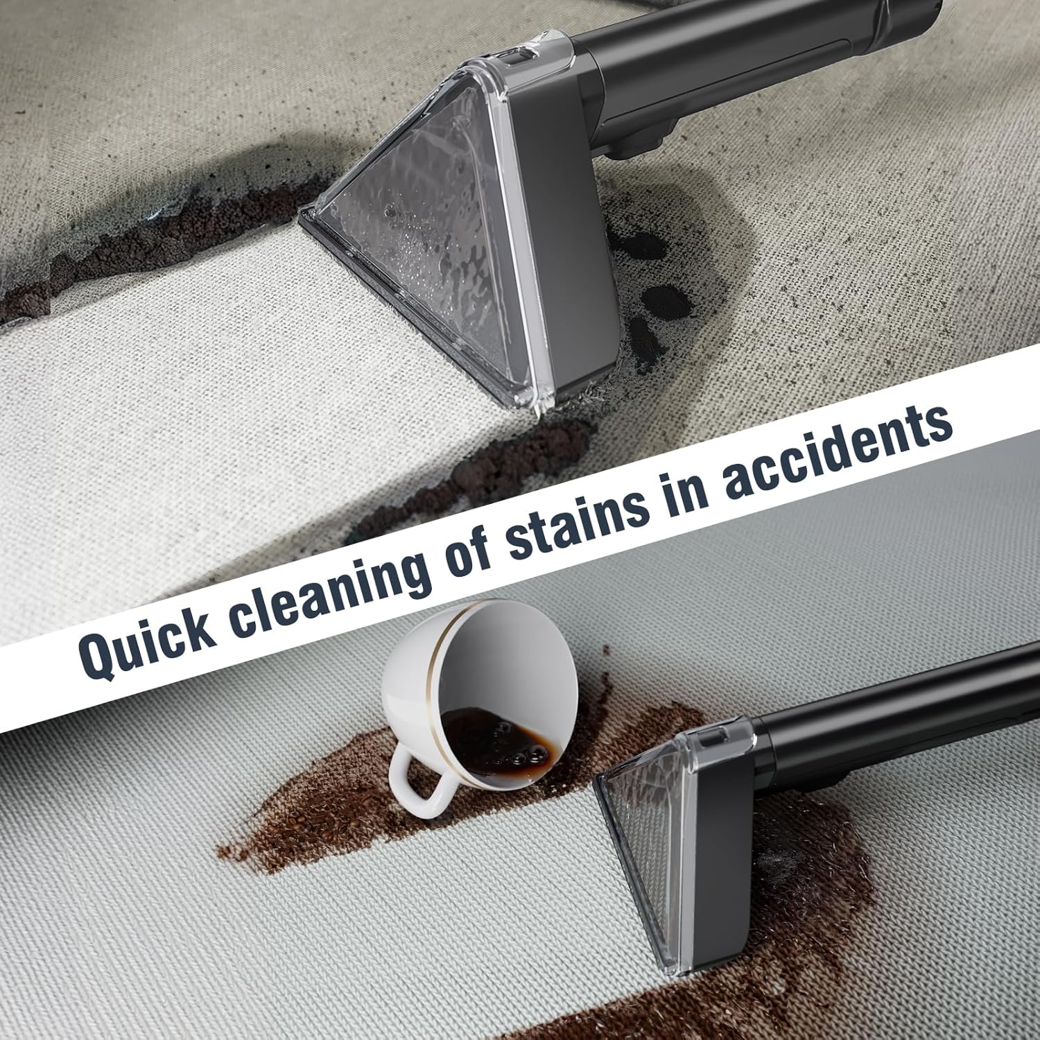 - 【POWERFUL SUCTION FOR QUICK REMOVAL】Carpet cleaner machine is equipped with a 500W motor, which can provide a super suction force of 18Kpa, which can permanently remove stubborn spots and stains like mud, wine, pet messes and more from carpets, upholstery and car interiors. Also, equipped with a strong suction system, ensure that the carpet can dry quickly after cleaning, quickly return to its normal state.