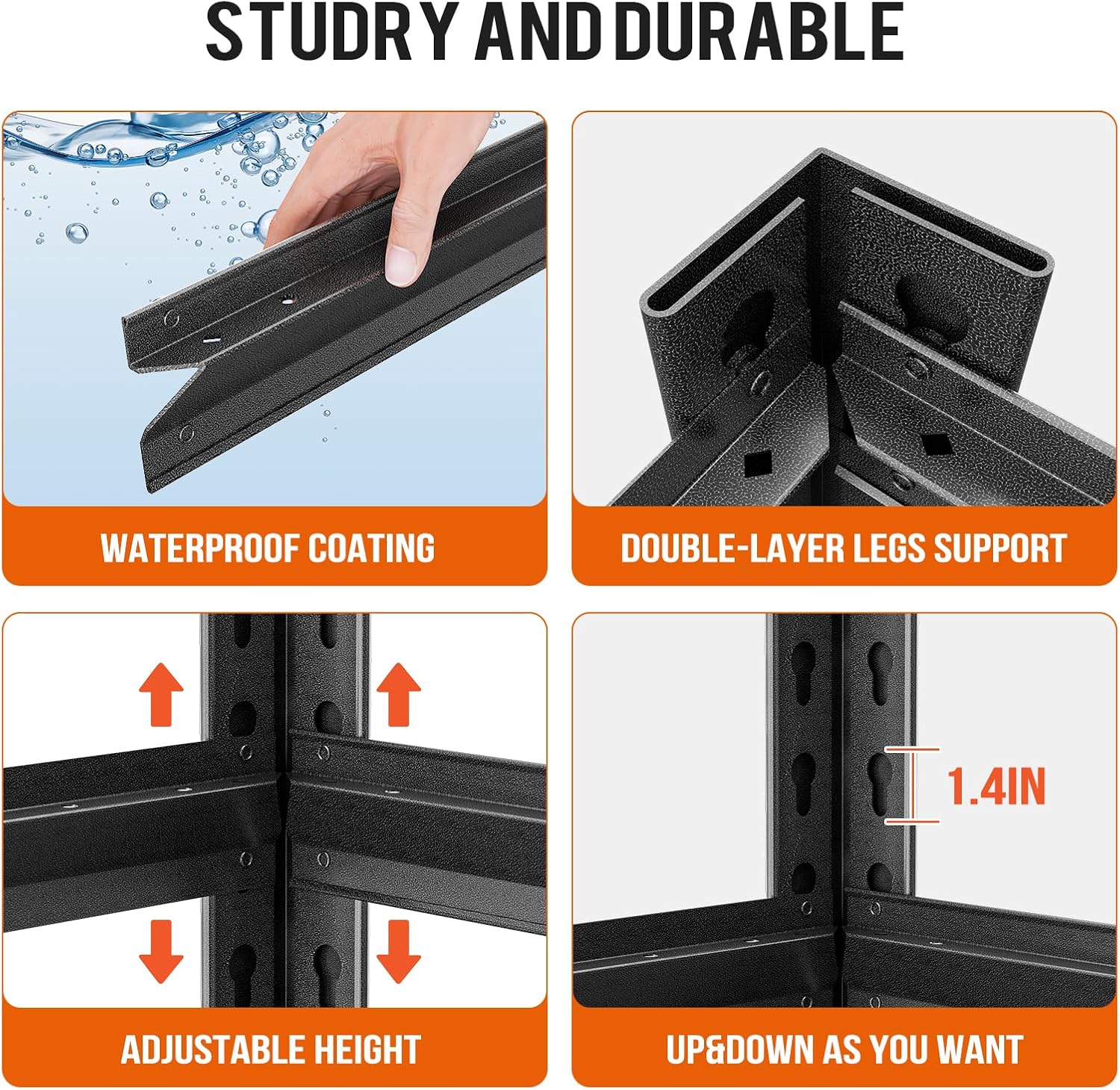 - 【1600LBS Garage Storage Shelves Heavy Duty】:Thickened metal shelving are made of quality metal material, covered with rust-proof powder coating, anti-scratch, rust-resistant, durable and easy to clean. Each level has sturdy support rib and can hold up to 320lbs. Garage shelf's total max load weight is 1600lbs. Double thickened metal legs are designed to provide excellent support. This rack shelf is more stable and sturdy than regular metal shelf for long-term use
