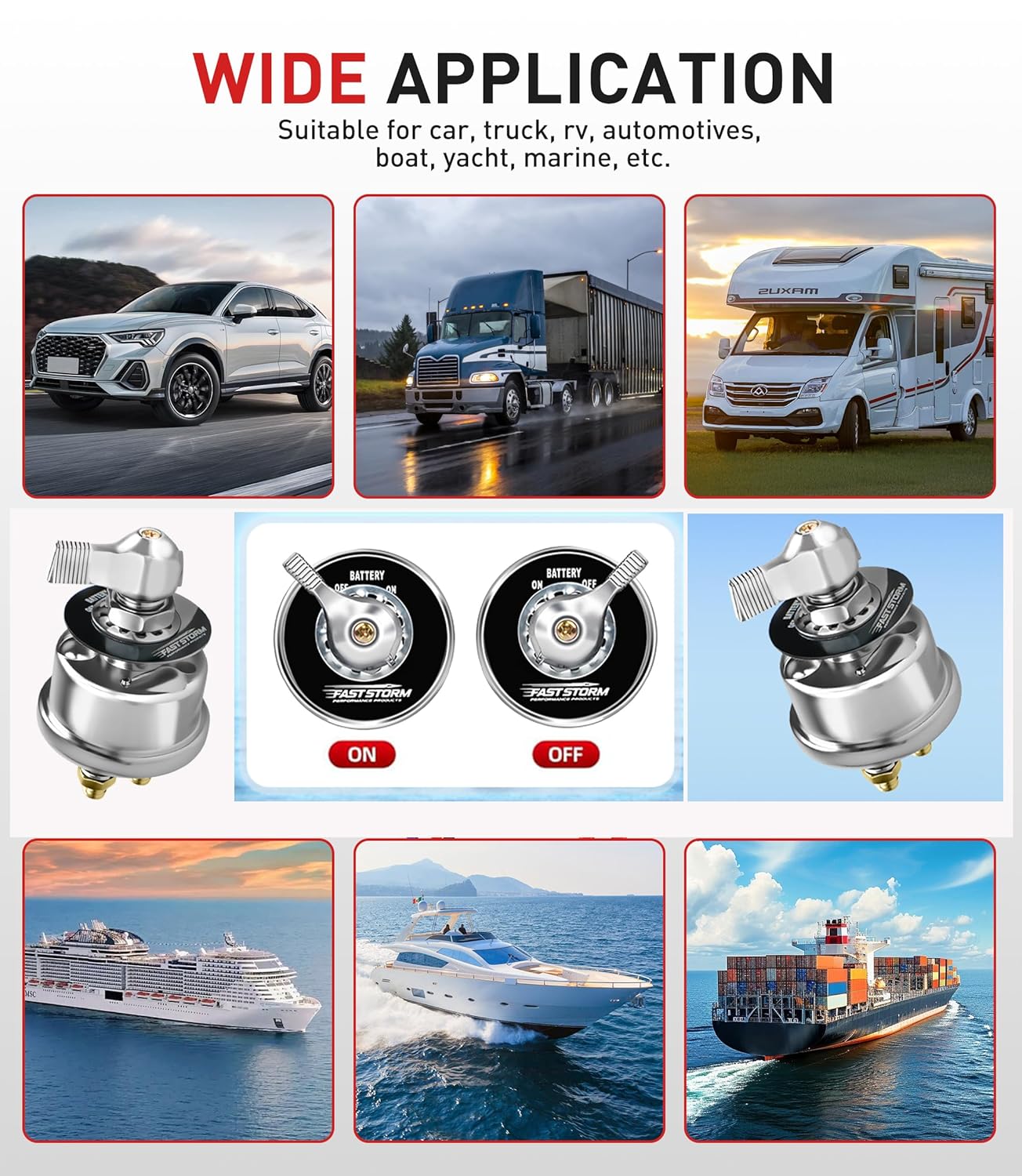 - 【Zero-Noise Safety Guardian】 Our 12V battery disconnect switch used for 12-48 VDC systems to isolate and secure the electrical system, operates silently with no humming or buzzing, ensuring peace of mind while maintaining ultimate protection. It instantly cuts power to prevent battery drain, electrical fires, and accidental discharge – perfect for cars, RVs, boats, and solar systems