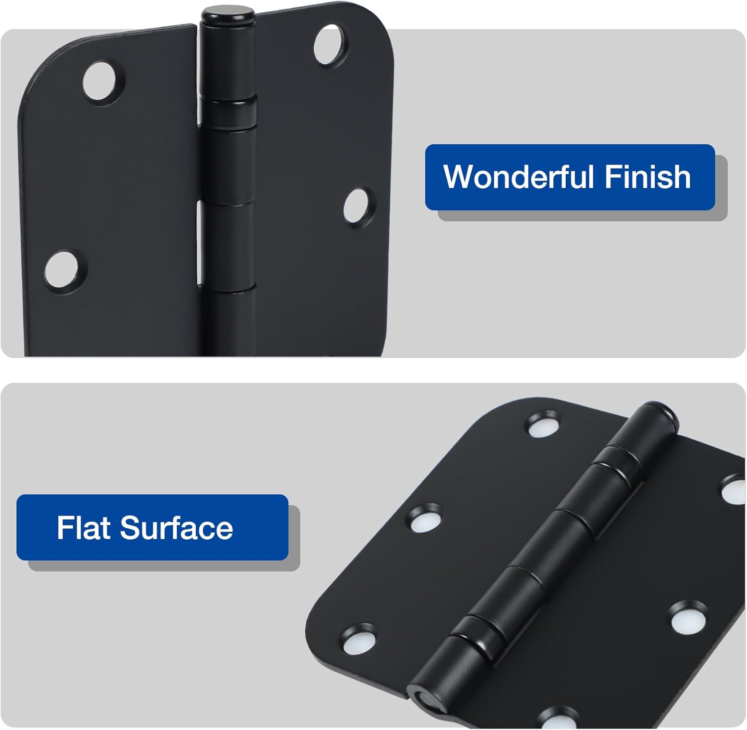 - Door hinges Black Matte 3.5 inch with 5/8 rounded corners and 6 holes for front door, cabinet, wooden box. Safe black door hinges 3.5" includes 36 free screws for quick and easy installation. Mat black door hinges can be rotated 270 degrees. The extra long screws will come in handy specially when replacing existing hardware using the same hole pattern.