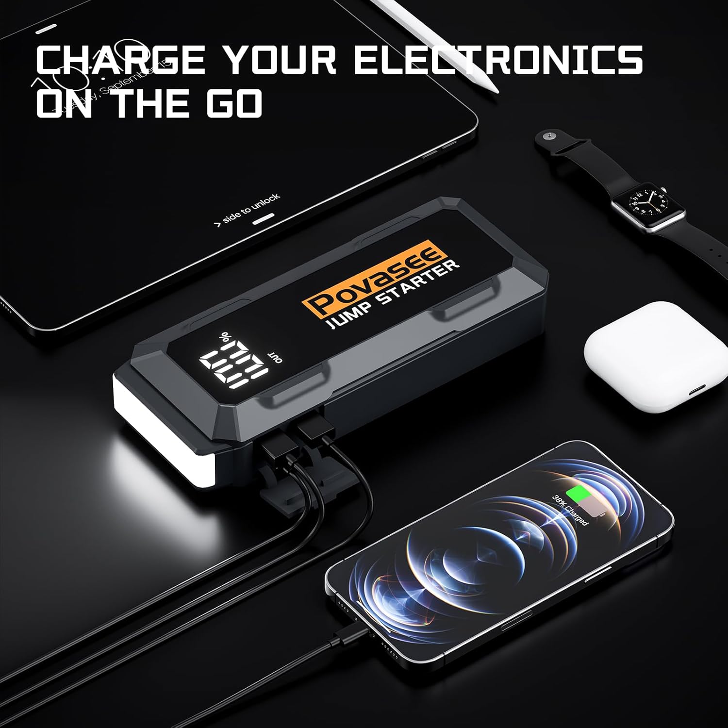 - HD LCD Display: Unlike conventional simple indicator lights, Povasee Car Jump Starter fitted with a 3" LED display. It clearly shows remaining power and operational status, ensuring you never have to guess how much power remains.