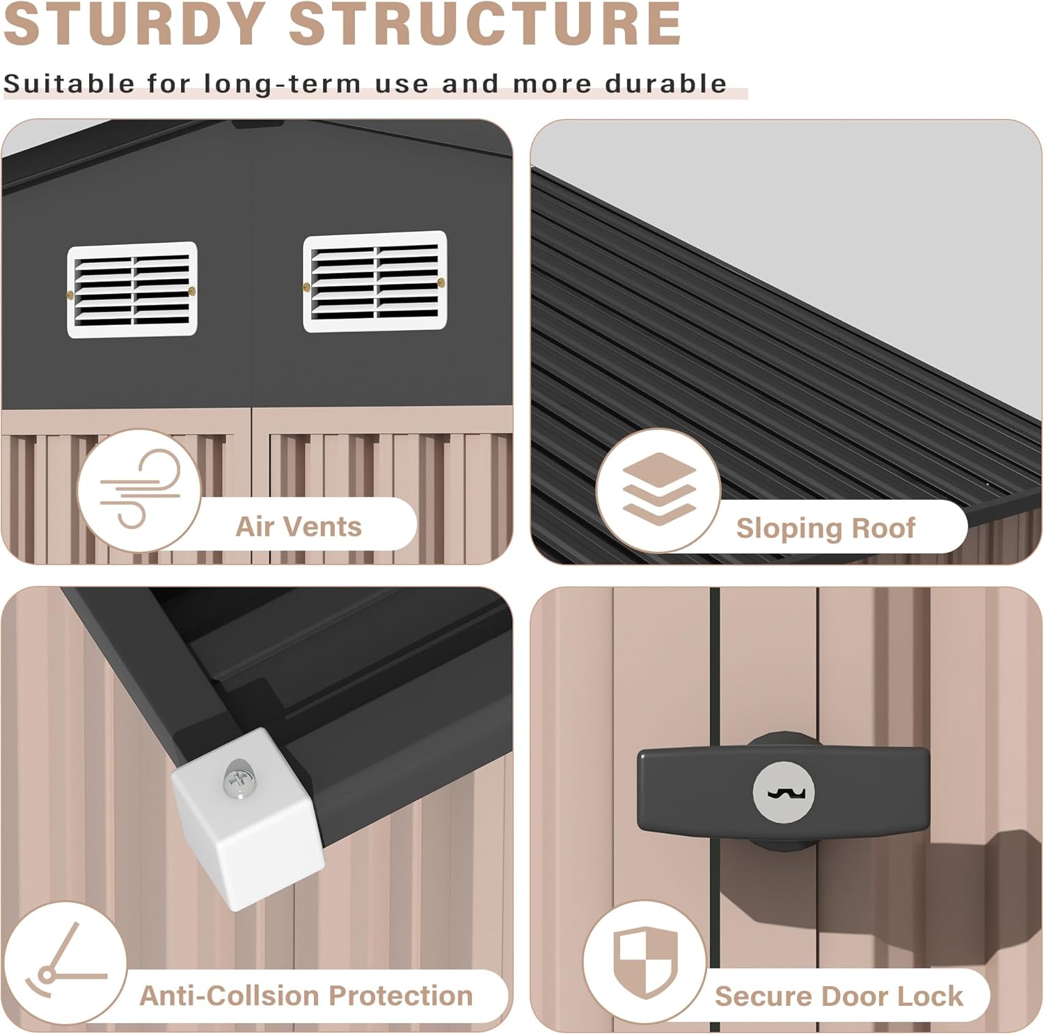 - Sloped Roof & Lockable Door & Air Vents: The sloped roof is engineered to enable rapid drainage of rainwater. The lockable doors serve to bolster security, warding off both strangers and small animals from unintended entry. The incorporation of air vents is a strategic design choice that significantly boosts air circulation. This, in turn, safeguards your stored items against mold growth and damage during sweltering and humid summers