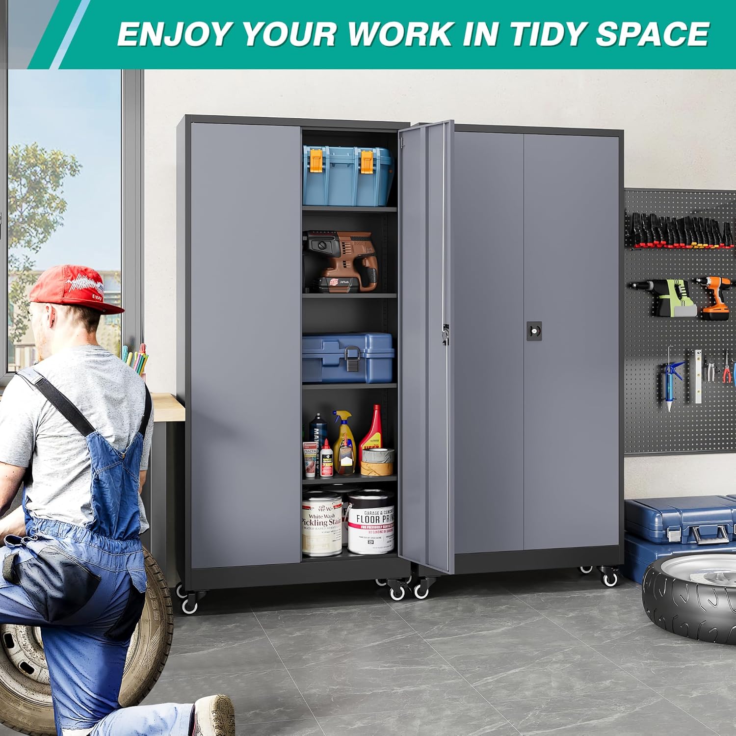 - ✔️☆【5 Tiers for Large Capacity】: Lockable garage cabinets storage uses 4 adjustable shelves. You can move to the desired height by adjusting the shelf according to the size of the things. so that you can divide the tool cabinet space distribution. You can also design garage storage flexibly and remove the shelves for more standing room.