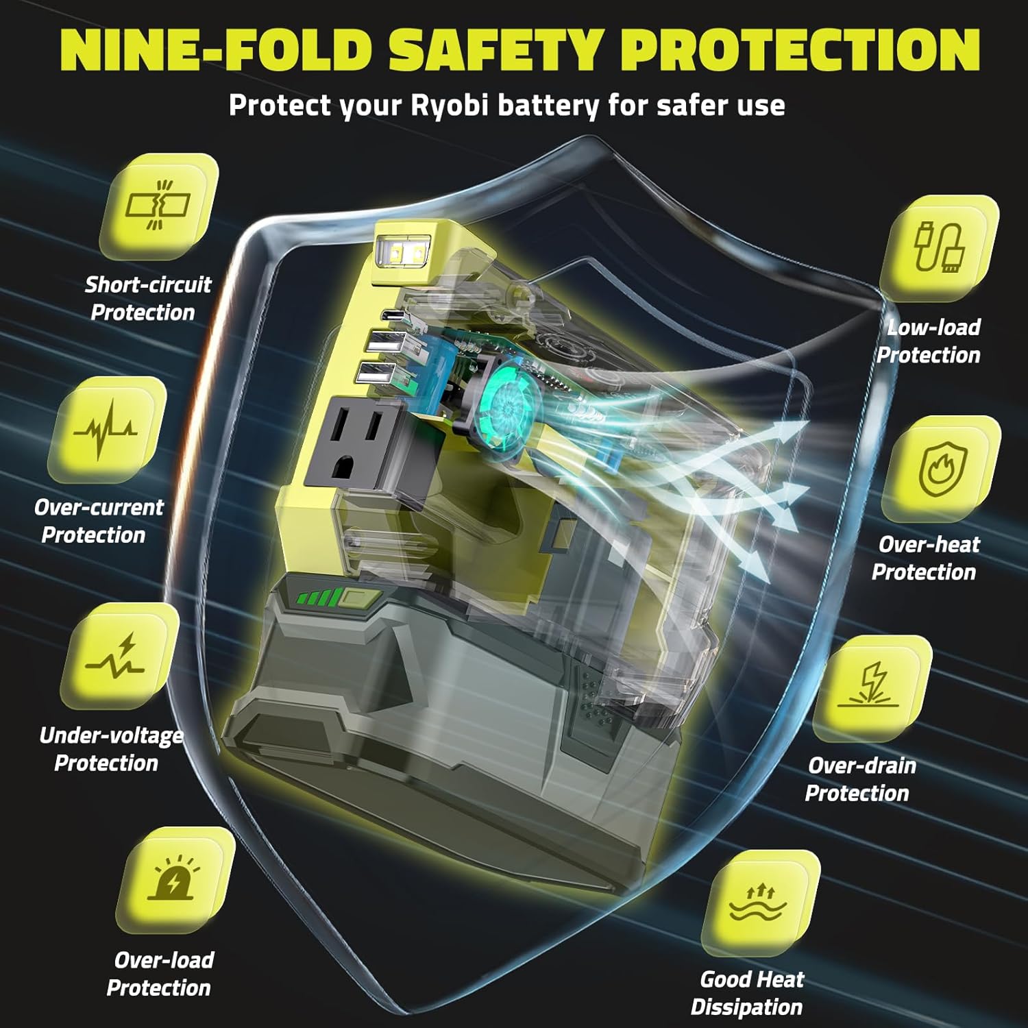 - ā¶[Compatible with]The battery inverter Compatible With Ryobi 18V Li-ion Battery: ONE+ P189, P190, P191, P192, PBP002, PBP003, PBP004, PBP005, PBP006, P193, P194, P195, P197, P102, P103 , P104, P105, P107, P108, P109, RB18L50, BPL1820, BPL-1820G, BPL-1815, BPL-18152(battery not include) This power inverter swiftly converts batteries into a portable charger, eliminating the need for bulky adapters. Ensure continuous power for various devices during outages or travel.