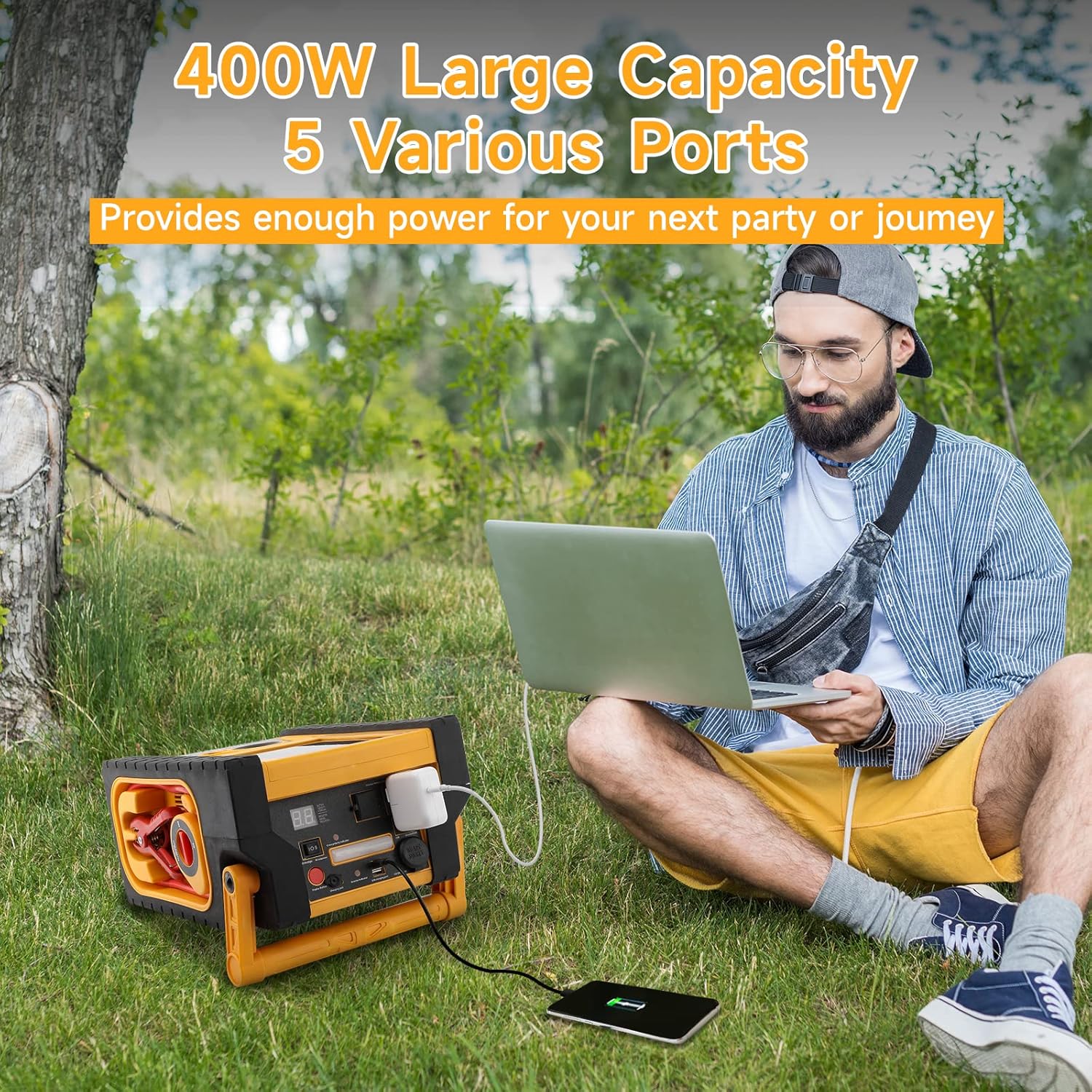 - Portable power station jump starter: HH529 has five outlets, including two 110V AC outlets, a 12V DC accessory outlet, and two 2A USB port. The built-in inverter generates 400 peak watts of electricity for the two 110V AC outlets. Outdoor generators are suitable for travel, camping, emergency power outbound and various outdoor demand.Buy this launcher combination and place it in the car trunk to prepare from time to time!