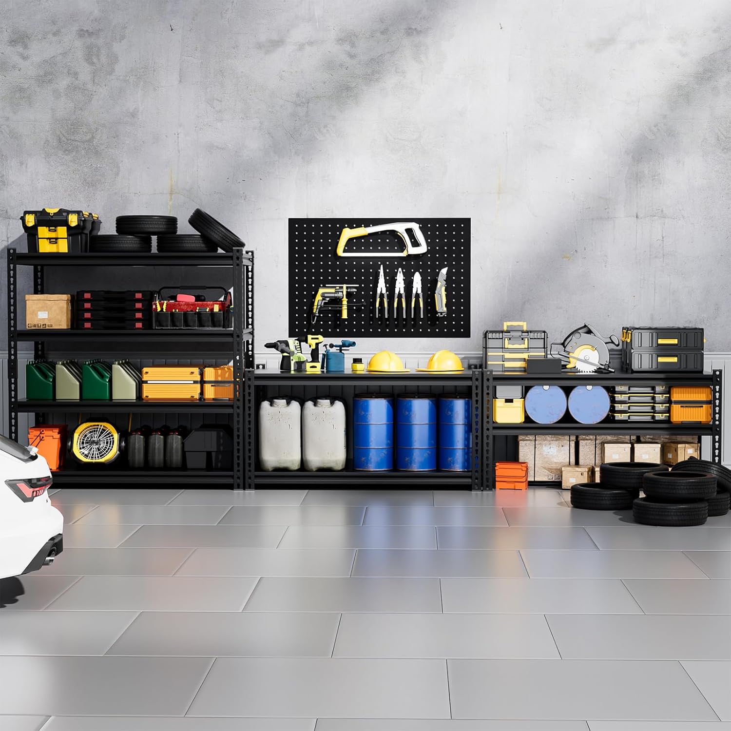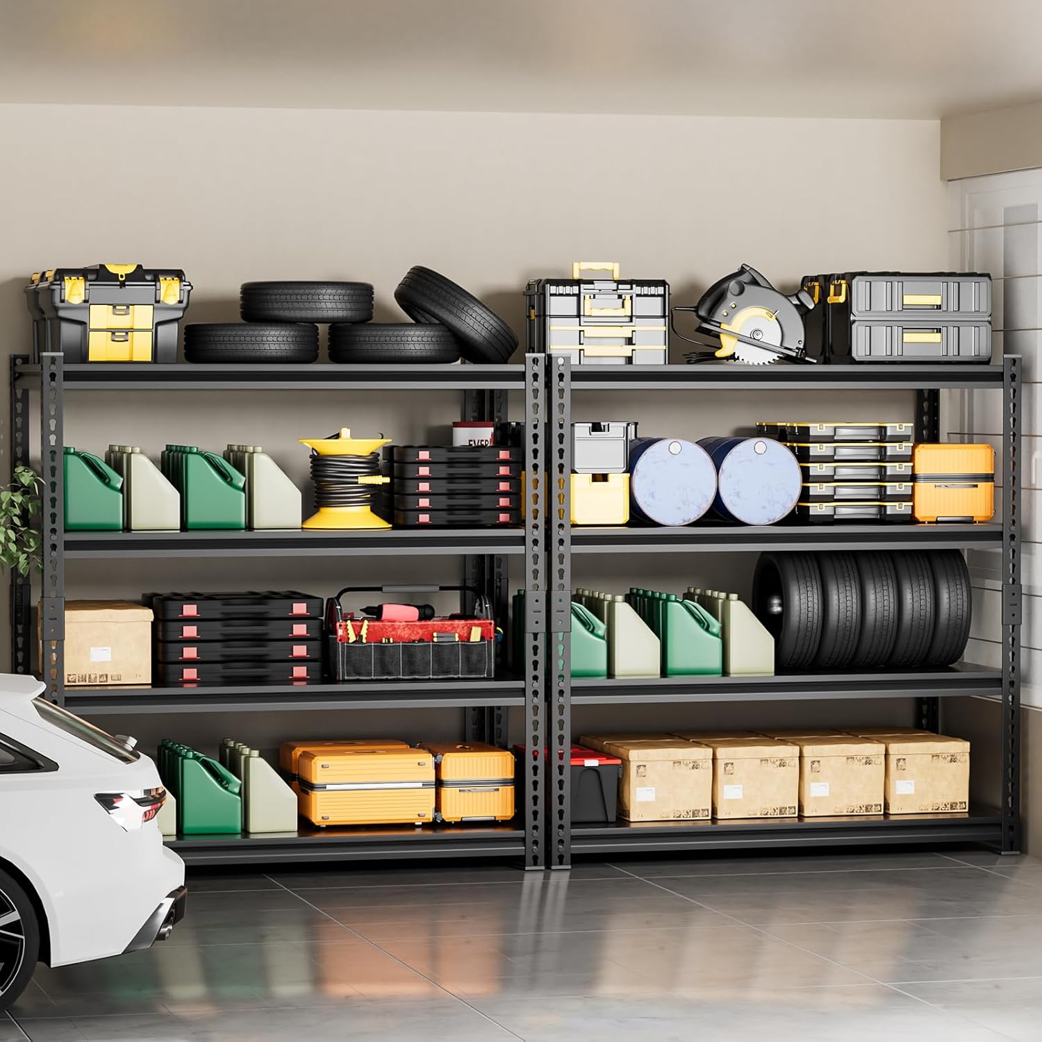 - 2500LBS Garage Shelving: Each shelf comes with four reinforcement rods to provide extra support. With a total capacity of 2,500 lbs, it's perfect for storing heavy tools in garages, stores, kitchens, and basements. Sleek and professional, it fits any space.
