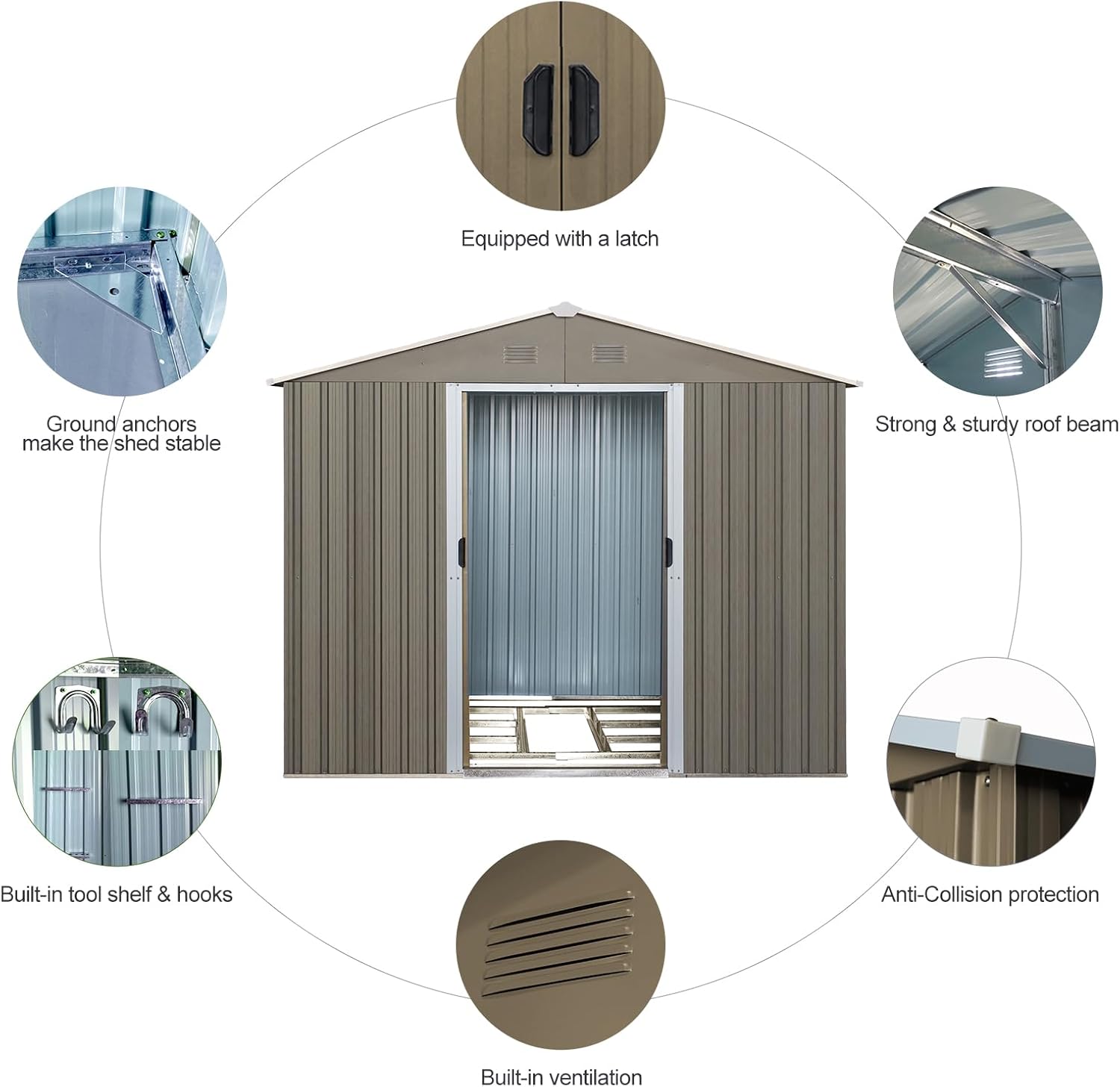 - š”šš„š„-š°šššš”šš« šššØš«šš š šš”šš: Our metal shed 6x8 features sliding doors that open and close smoothly, with handles and a heavy-duty lock for added security. It serves not only as a safe space for storing garden tools but also as a warm pet house. The sloped roof of the storage building effectively prevents leaks and snow accumulation, while the four integrated punched vents improve airflow, helping to keep your items dry.