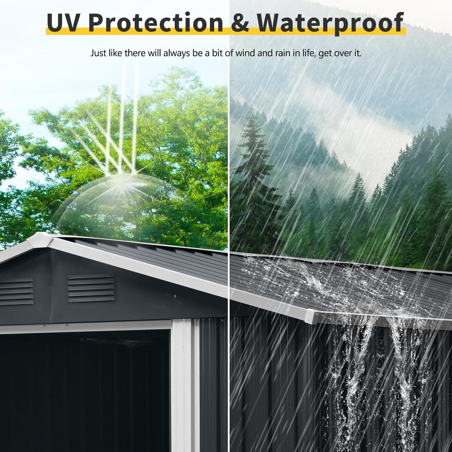 - š”šš„š„-š°šššš”šš« šššØš«šš š šš”šš: Our metal shed 6x8 features sliding doors that open and close smoothly, with handles and a heavy-duty lock for added security. It serves not only as a safe space for storing garden tools but also as a warm pet house. The sloped roof of the storage building effectively prevents leaks and snow accumulation, while the four integrated punched vents improve airflow, helping to keep your items dry.