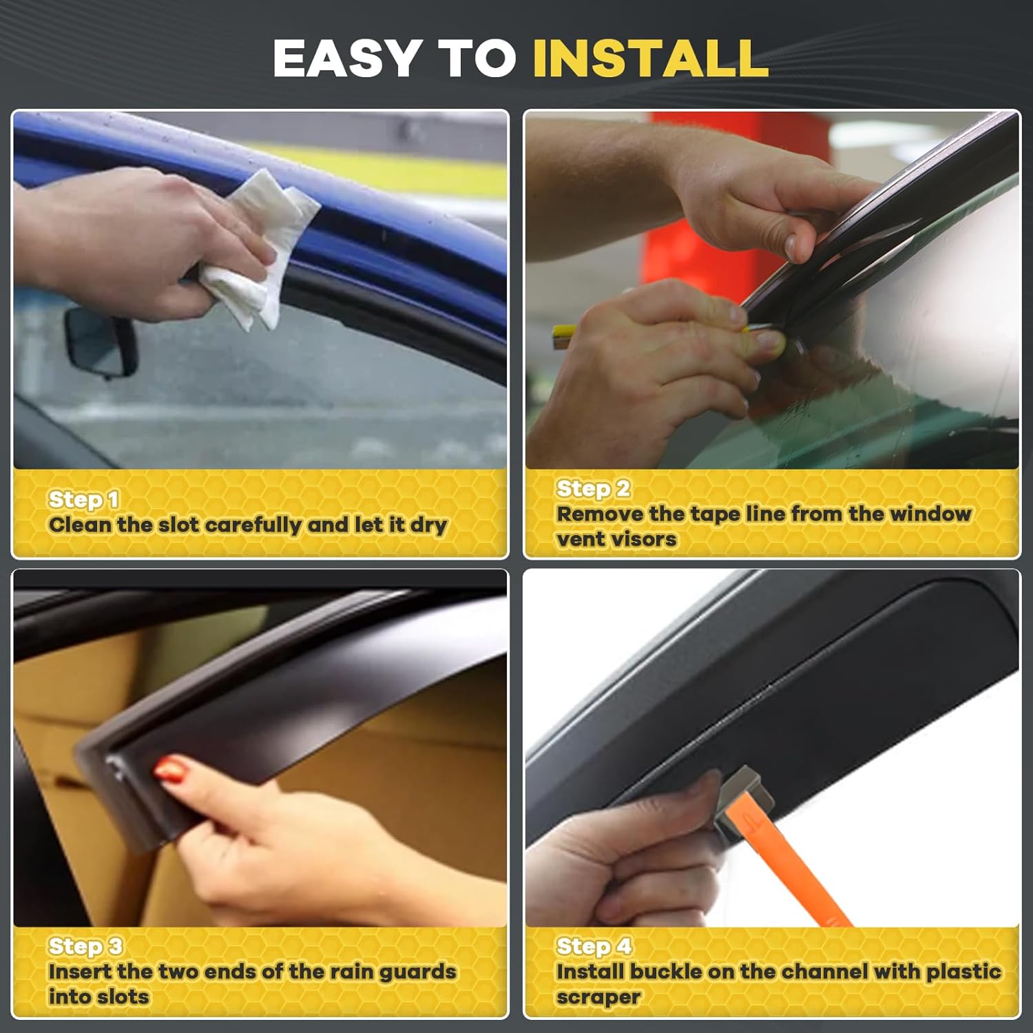 - 【In Channel Design】 CHYKORLA Window vent visors install in the window channel, provides perfect fit and sleek look for your car. Come with 4 pcs side window deflectors, 8 pcs clips, 1 pcs plastic Crowbar for a durable and secure installation. No complicated instructions are needed. Attention: Please apply the clip to fix the rain guards