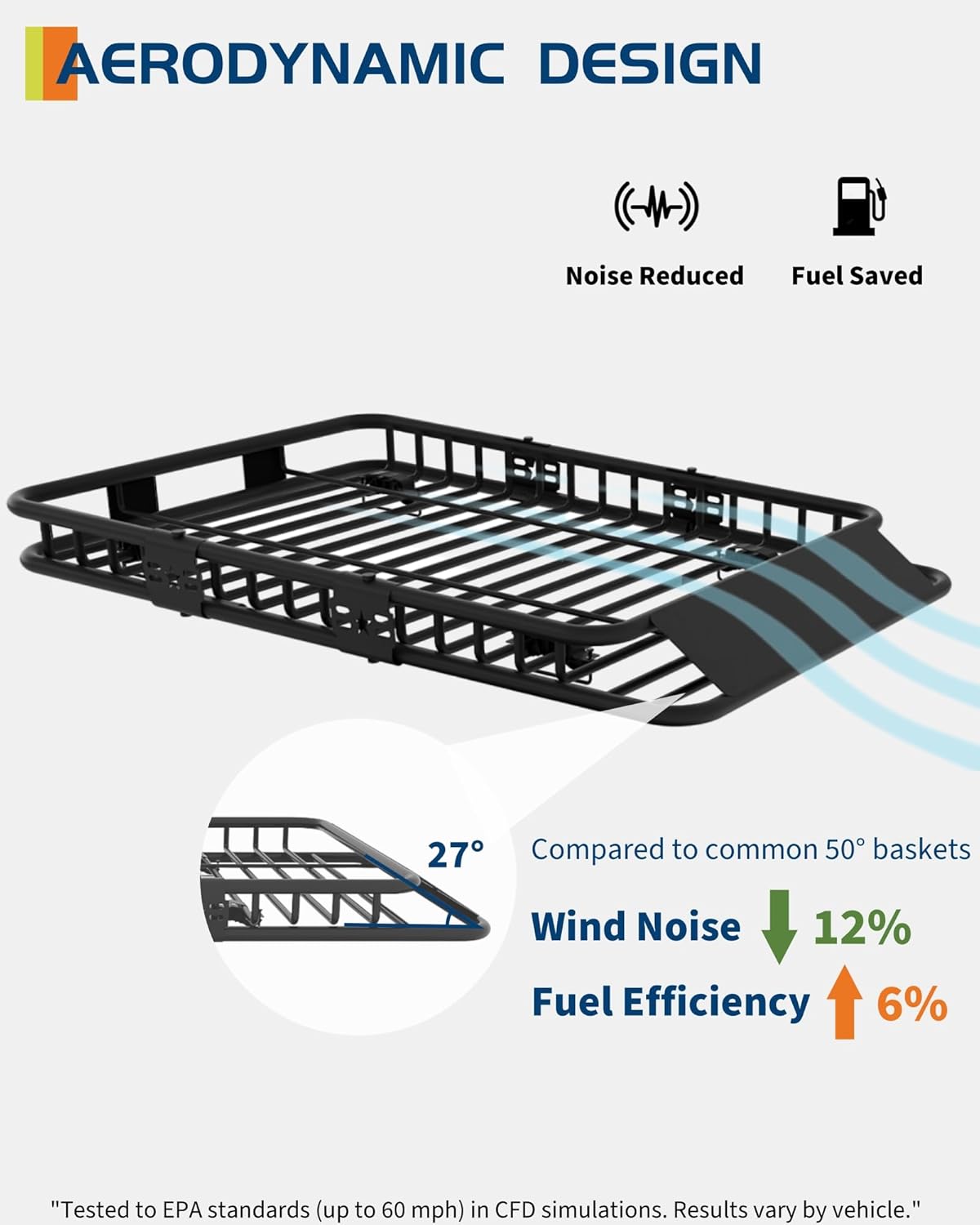 - 【LARGE STORAGE CAPACITY】Free up space in your vehicle with this roof rack cargo basket that can hold up to 200 Lbs. Overall dimensions include: 64"(L) x 39"(W) x 6"(H)