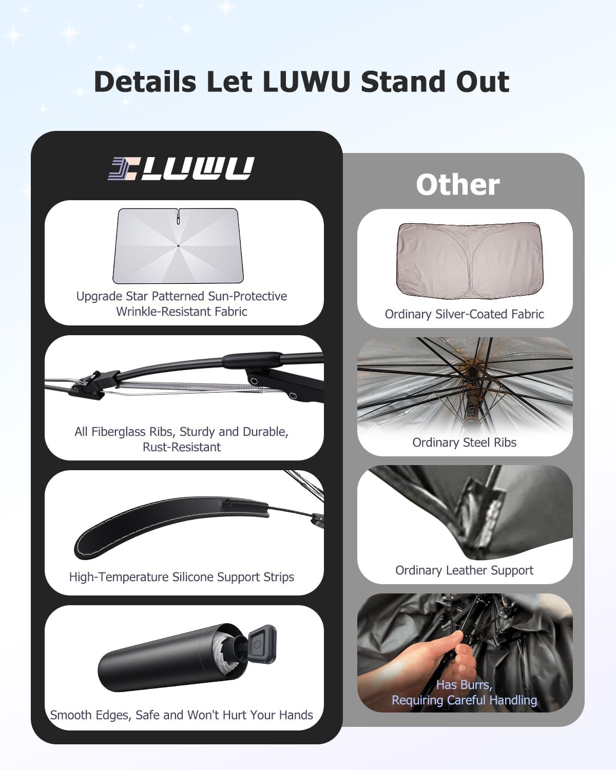 - [Cooling & Comfort Experience Enhanced] Our 2025 updated car windshield sunshade are perfect for the coming summer. It uses our innovative ice crystal cooling material to evenly distribute the heat across the umbrella, mitigating the sun's heat. Windshield sunshade umbrella keep the interior of your car at a comfortable 80 degrees Fahrenheit, ensuring a cool, enjoyable ride