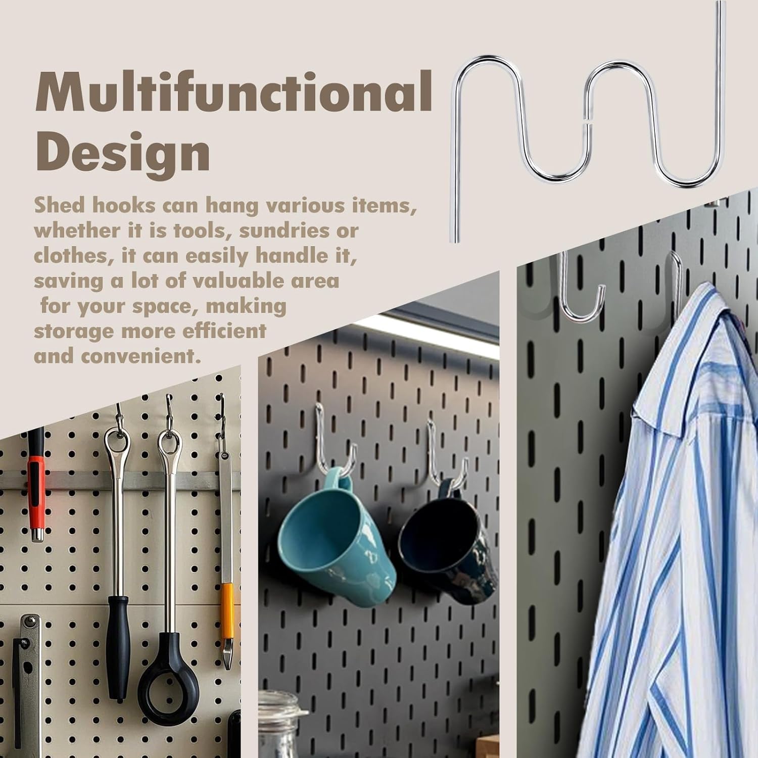- Sturdy and durable: Shed hooks is made of stainless steel and is popular for its sturdiness and durability. Each shed hook is about 2.65 inches long and of moderate size, which can easily bear heavy objects. It will not deform, rust or lose stability during long-term use, ensuring that your items are always safely hung, making your shed storage space more stable and reliable.