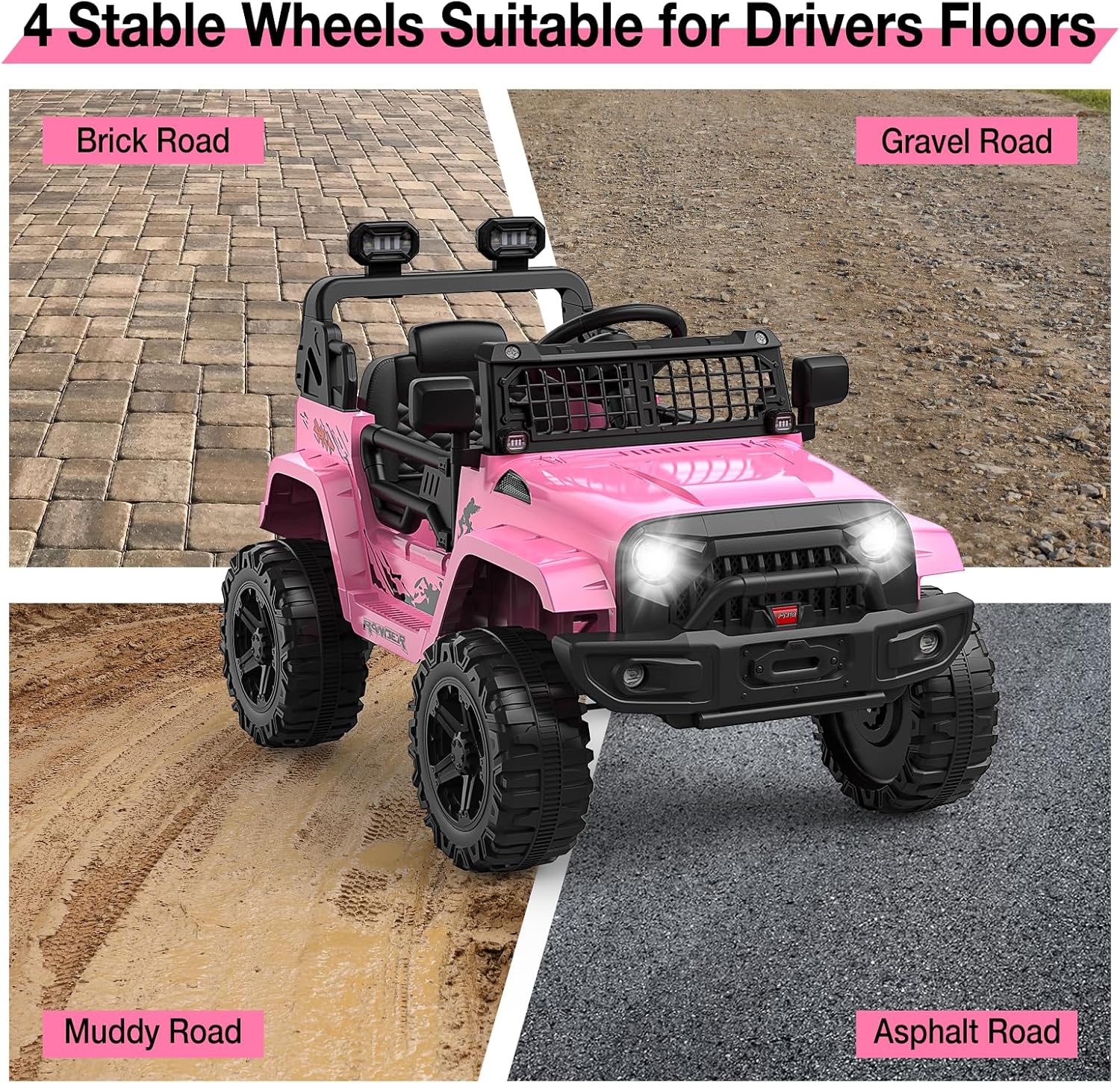 - ā” 12V Power & All-Terrain Performance: High-torque 12V motor with puncture-proof tires conquers grass/concrete/driveways. LED headlights ensure nighttime visibility.
