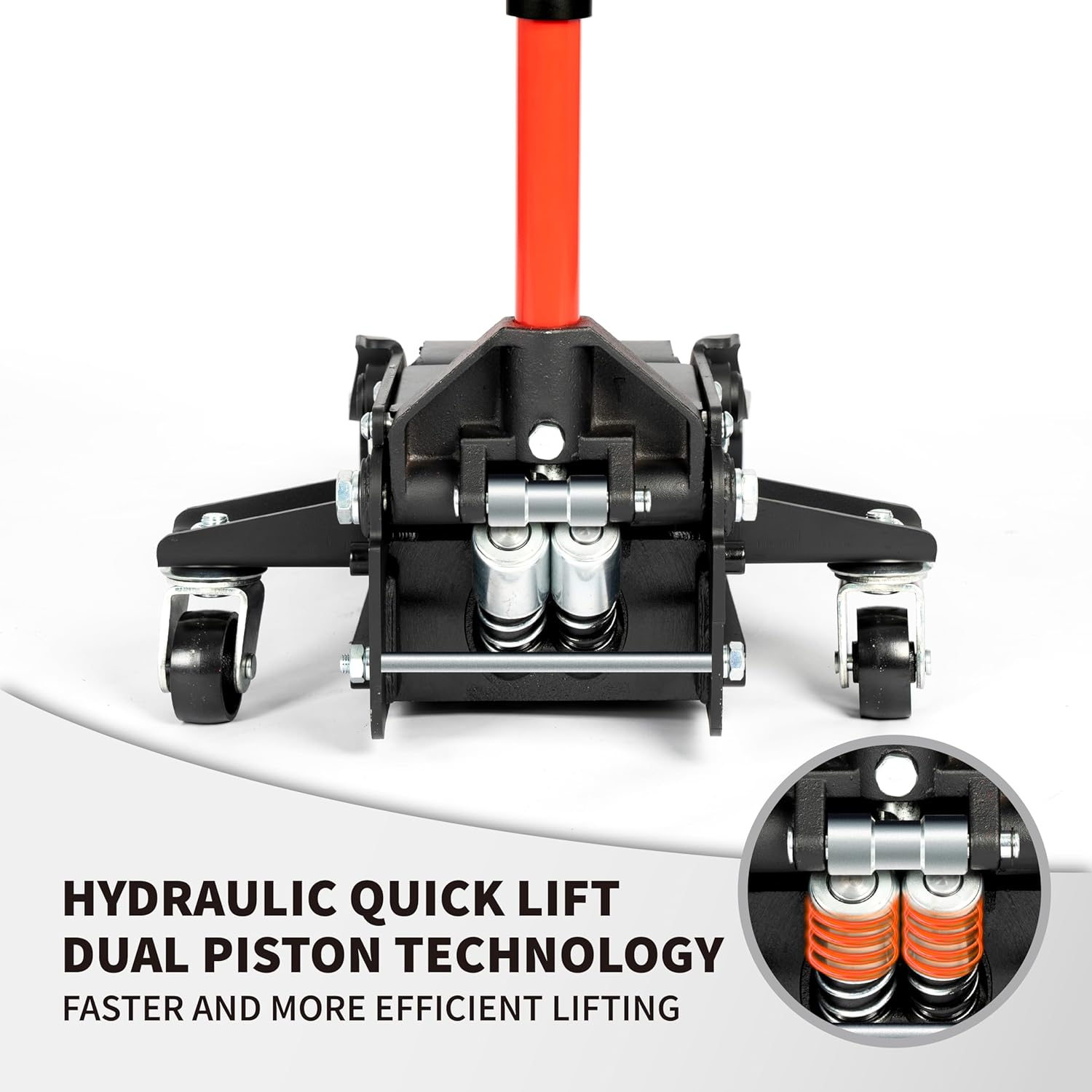 - Hydraulic Quick Lift Dual Piston Technology---Equipped with an innovative dual-piston quick lift pump system, this floor jack significantly reduces the time required to raise your vehicle. The dual-piston design allows for faster and more efficient lifting, reducing the number of strokes needed to reach maximum height.
