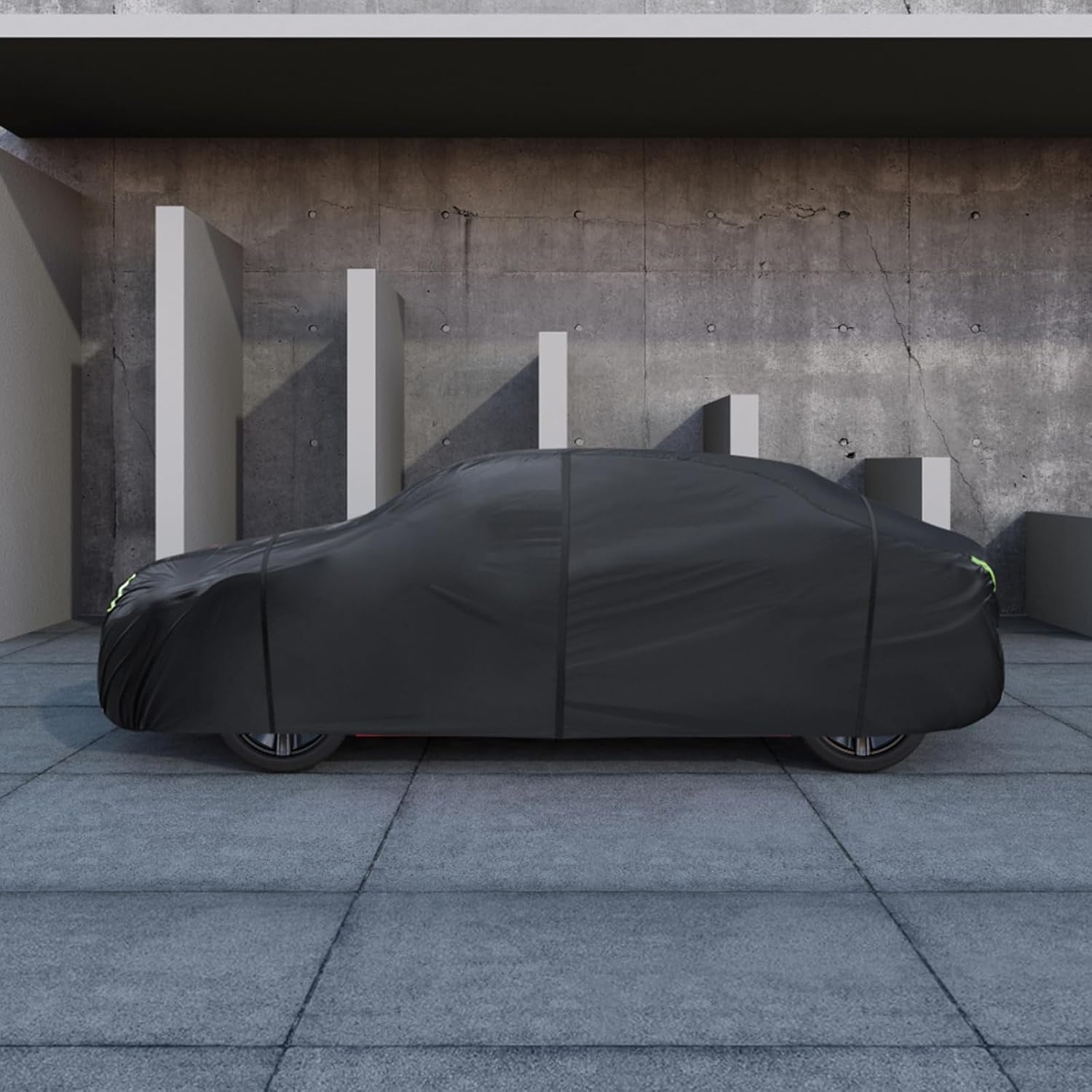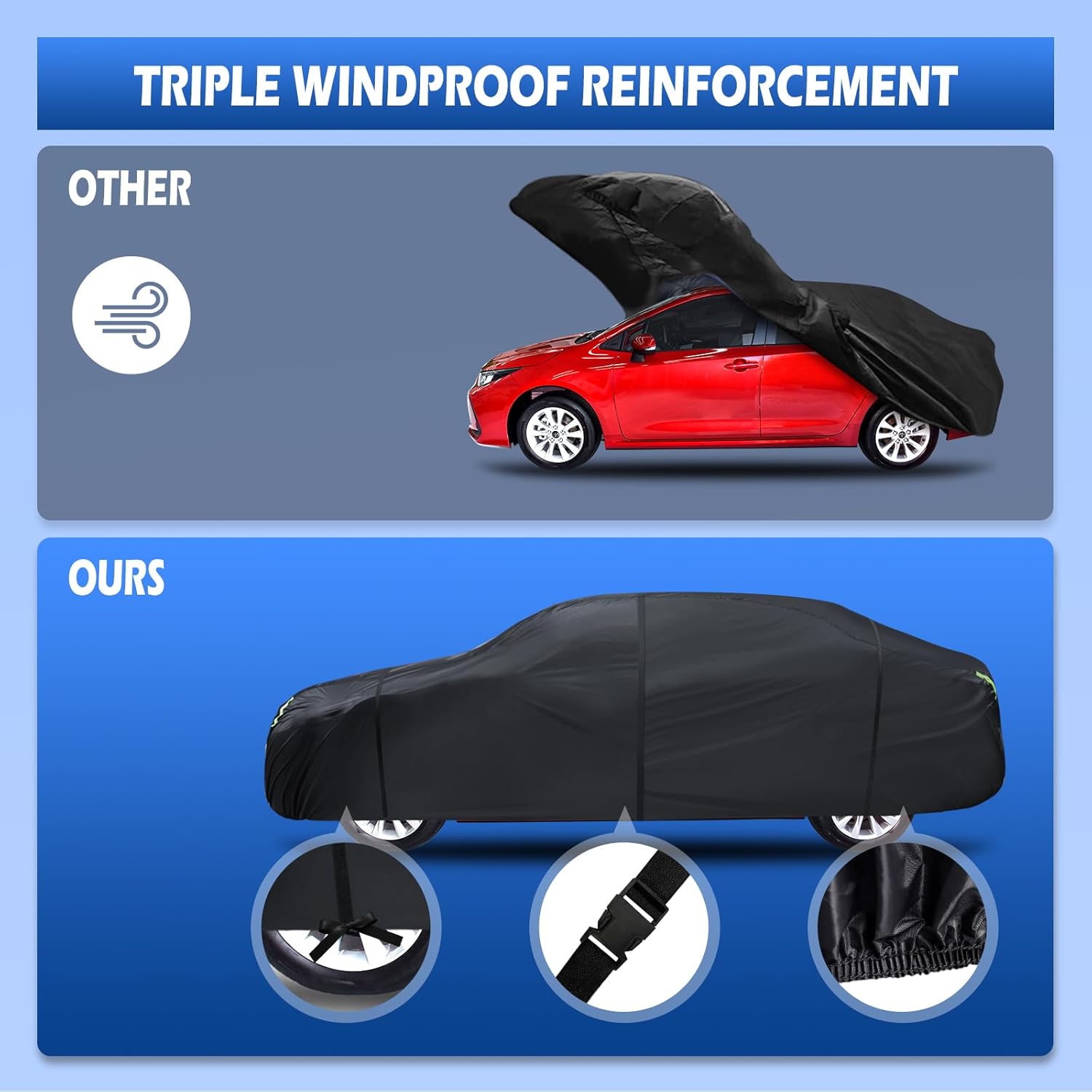 - ăWind-Resistant DesignăThe car cover waterproof all weather has been specially designed to resist strong winds. â Equipped with two bungee cords, which only take a few seconds to tie to the tires on both sides, it securely covers the front and rear of the car. ⥠There are specially designed windproof straps at the bottom to pass through the car's middle to ensure that the cover is not blown away. âą The adjustable elastic hem makes it easy to adjust the size and fix the cover to the car body.