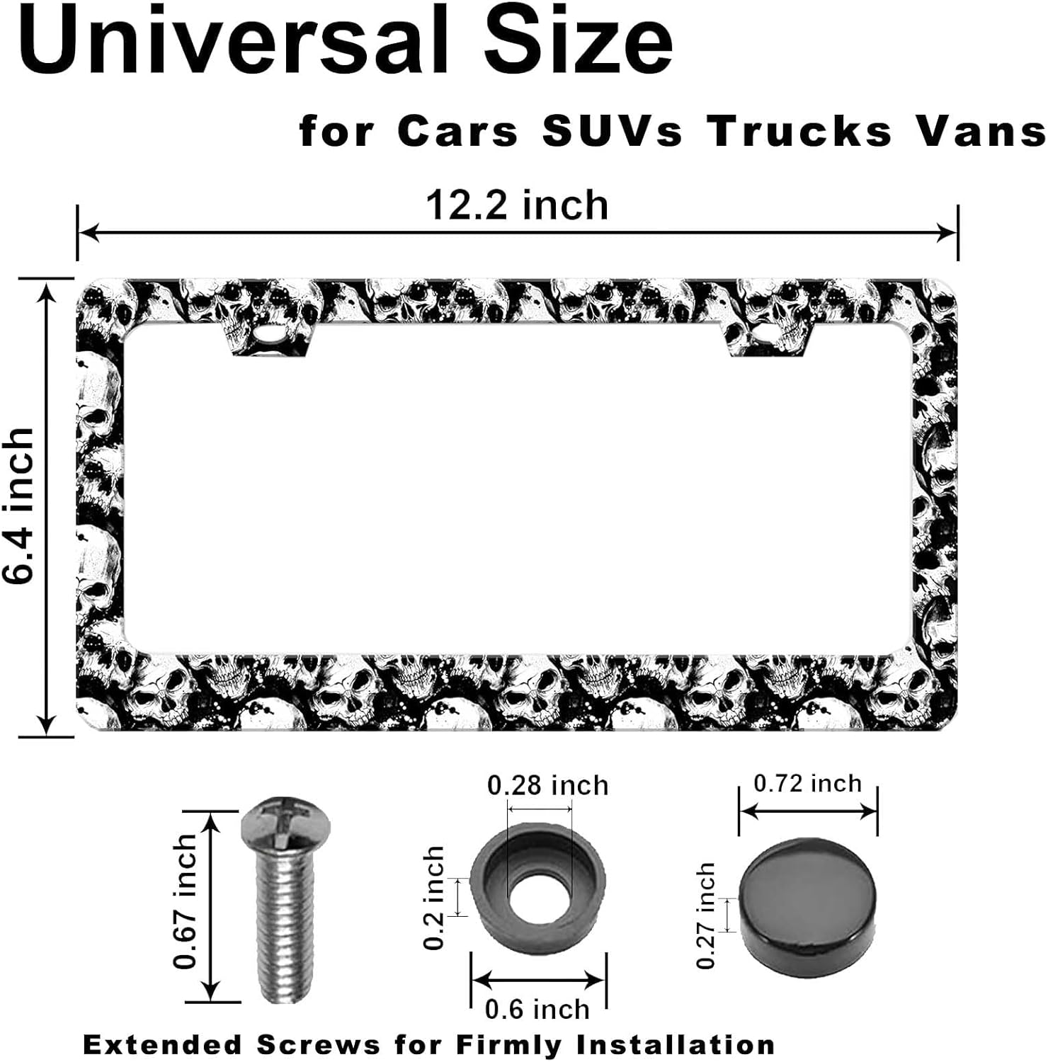 - UNIVERSAL Fits ALL US Vehicles β The license plate frames skulls Universal Design Works with Any License Plate Size. Fits Cars Sedans, SUVs & Trucks.