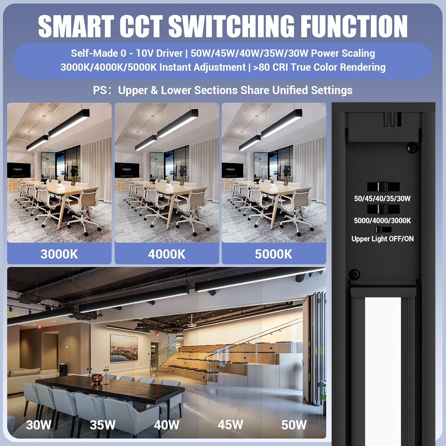 - LINKABLE AND 3000/4000/5000K 3CCT: The suspension linkable led lights can stand individually or in Seamless continuous runs with up to 8 lights, providing clean architectural lighting for your building. Compatible with 0-10V dimmer (not included) to control brightness from 0%-100% without flickering and buzzing.