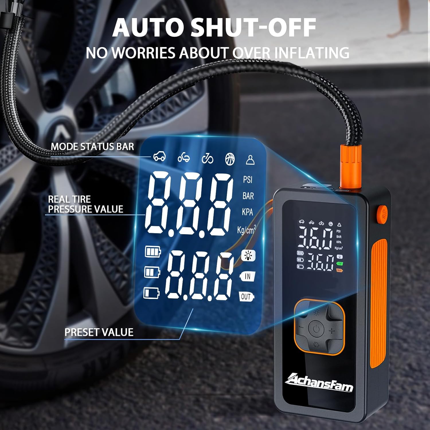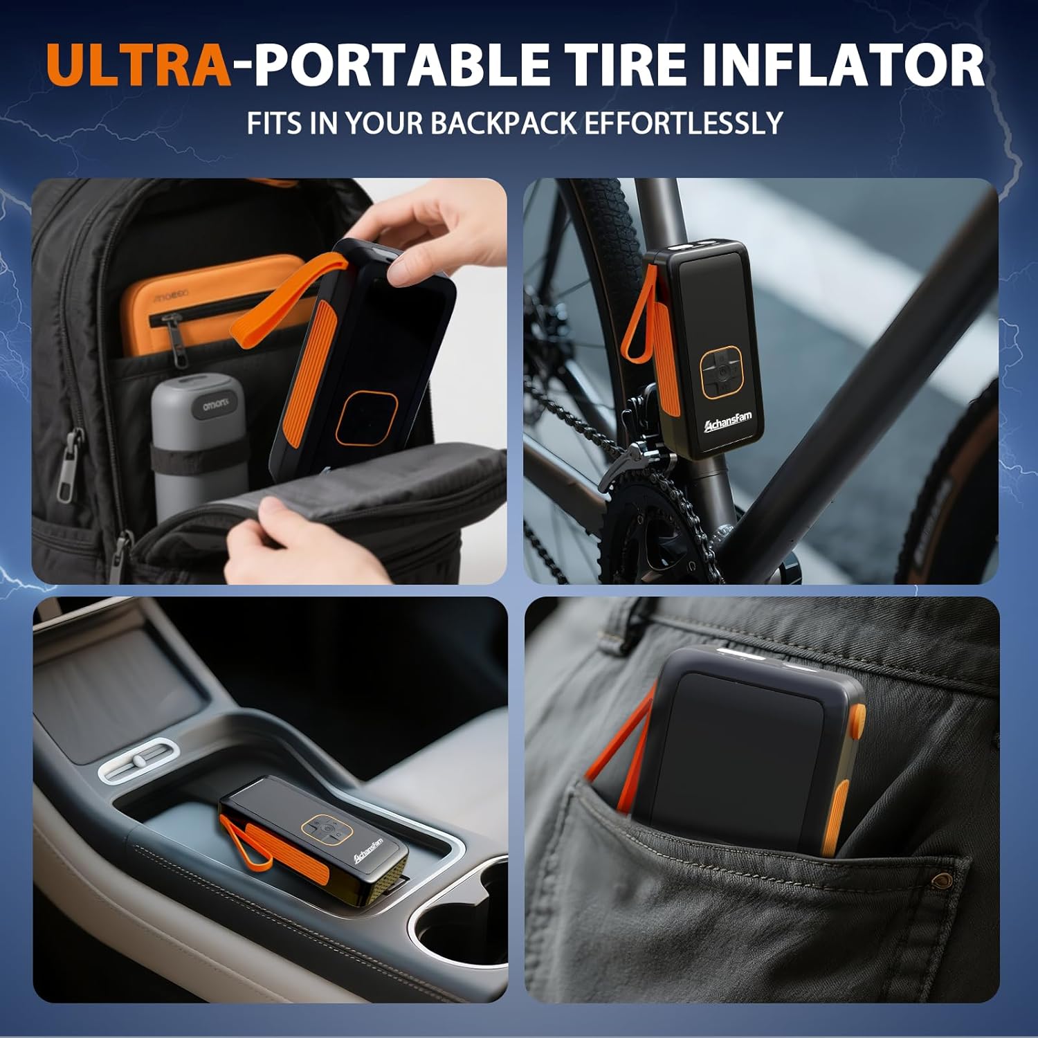 - Portable Air Compressor: Upgraded multi-purpose inflator with an innovative flip-top design for quick and effortless connection—just press lightly and start inflating! Perfect for seniors or anyone who values efficiency. Additionally, it minimizes air leakage when disconnecting, keeping tire pressure stable. Our one-touch pressure release valve allows you to safely adjust excess pressure without removing the pump, ensuring precise inflation.
