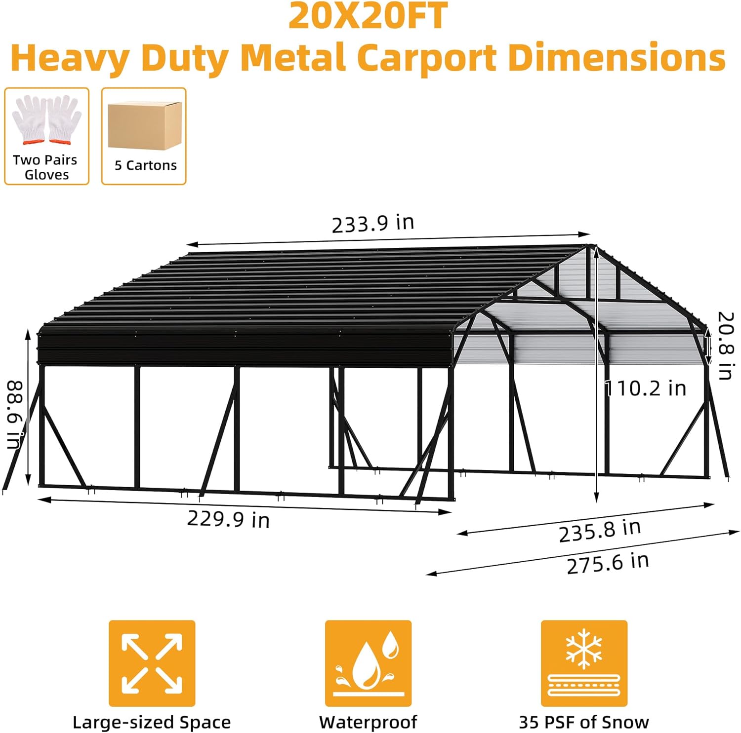 - DIMENSIONS - The heavy-duty outdoor metal carport canopy has external dimensions of 20 feet wide, 20 feet deep, and 8.5 feet high. The outdoor large metal carport canopy's internal measurements are 235.8 inches in width, 239.9 inches in depth, and 110.2 inches in height. The eave height is 88.6 inches, and the maximum entrance height is 110.2 inches. Note that the product will come in four packages, which might not arrive at the same time. Following the instructions makes garage assembly sim