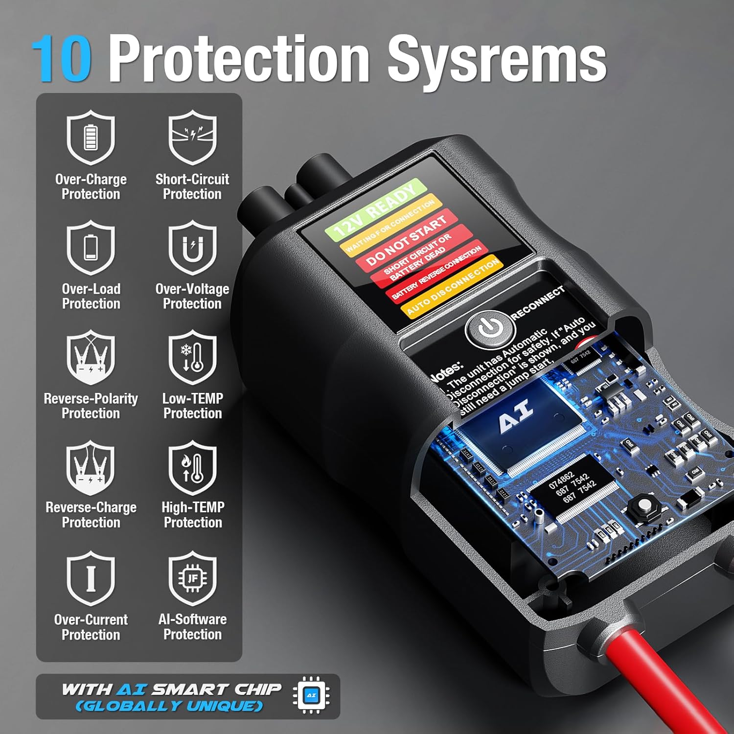 - ăINTELLIGENT SAFETY YOU CAN TRUSTă â This battery jumper starter portable features an integrated battery and smart clamp design, armed with 10 layers of intelligent protection. It guards against short circuits, reverse polarity, sparks, overheating, and more, ensuring safe operation for both you and your vehicle. Enhanced thermal efficiency and power management extend the jump boxâs lifespan, preventing damage from loose connections or battery issues.