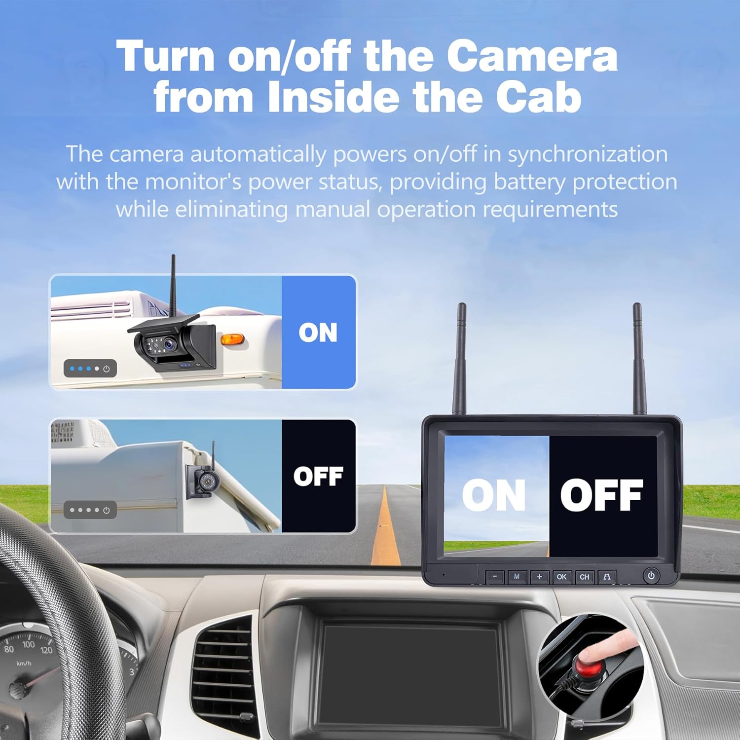 - 【Lag-Free 2.4GHz Wireless Connection】 Experience uninterrupted real-time monitoring through our enhanced 2.4GHz dual-antenna system, ensuring crystal-clear video transmission with zero latency. The extended 330-foot open-range coverage performs reliably even at highway speeds (102 mph), making it ideal for various applications: from passenger cars and SUVs to commercial vehicles like trucks, RVs, trailers, and marine equipment.