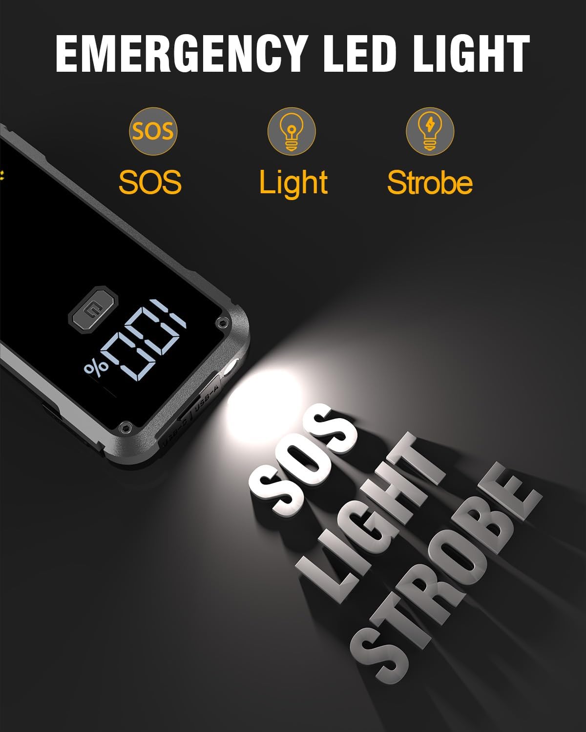 - MULTIPLE PROTECTION & SUPER BRIGHT LED - with 10 built-in safety protection technologies, you can safely start your vehicle easily and quickly in extreme environments (-4°F to 140°F) , Car emergency kit with 3 modes of LED light ( Lighting, Flashing, and SOS), it's perfect for daily use, commuting, outdoor activities, and perfect tool for emergencies