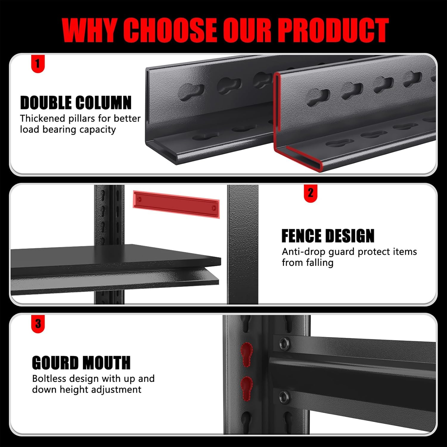 - ăDouble-Layer Post Design â Protect Your HandsăSay goodbye to flimsy single-layer post shelves that scratch easily. Our double-layer post design ensures thicker, higher-quality columns while safeguarding your hands from cuts and scrapes