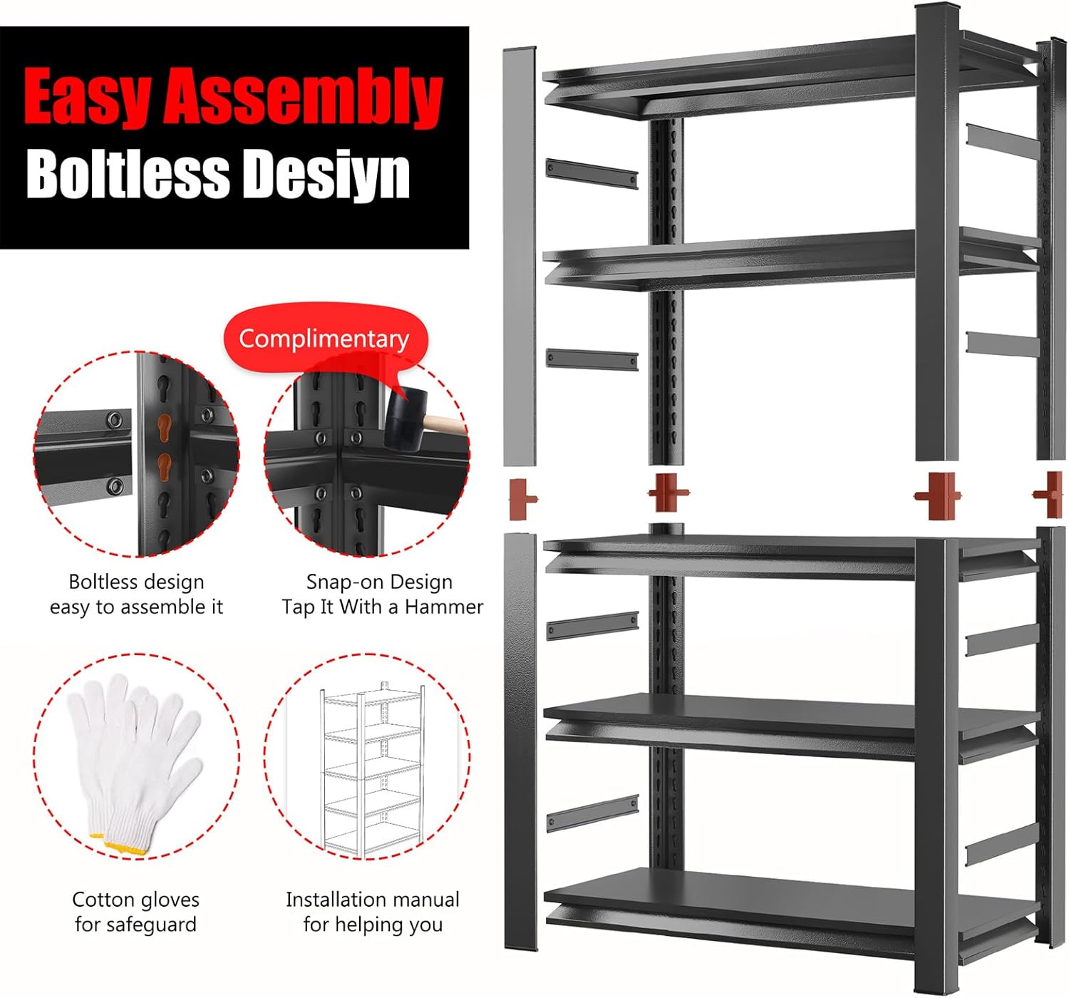 - ă10-Minute Easy Assembly & Thoughtful ServiceăNo nuts or bolts neededâeffortlessly assemble each standalone garage shelf in minutes! To simplify setup, we include a hammer and gloves. Plus, enjoy 24/7 customer support with every purchase. If any parts are damaged or missing, contact us for a swift resolution within 24 hours