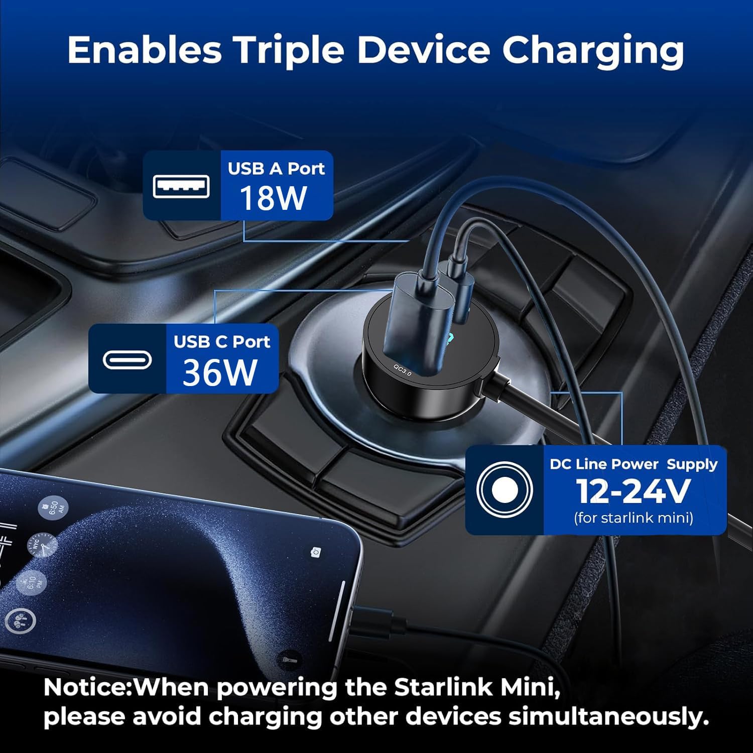 - ăDedicated Power for Starlink Mini in Cars, Trucks, RVsă: This Starlink Mini cable Specifically designed for Starlink Mini and Starlink Mini Accessories ensures a stable 12.8V-24V power supply in vehicles like cars, trucks, RVs, and boats. The DC plug is a dedicated connectorâdo not connect to other devices to prevent damage. Equipped with USB-C PD 36W and USB-A QC 18W ports, avoid simultaneous charging of other devices while powering Starlink Mini for optimal performance