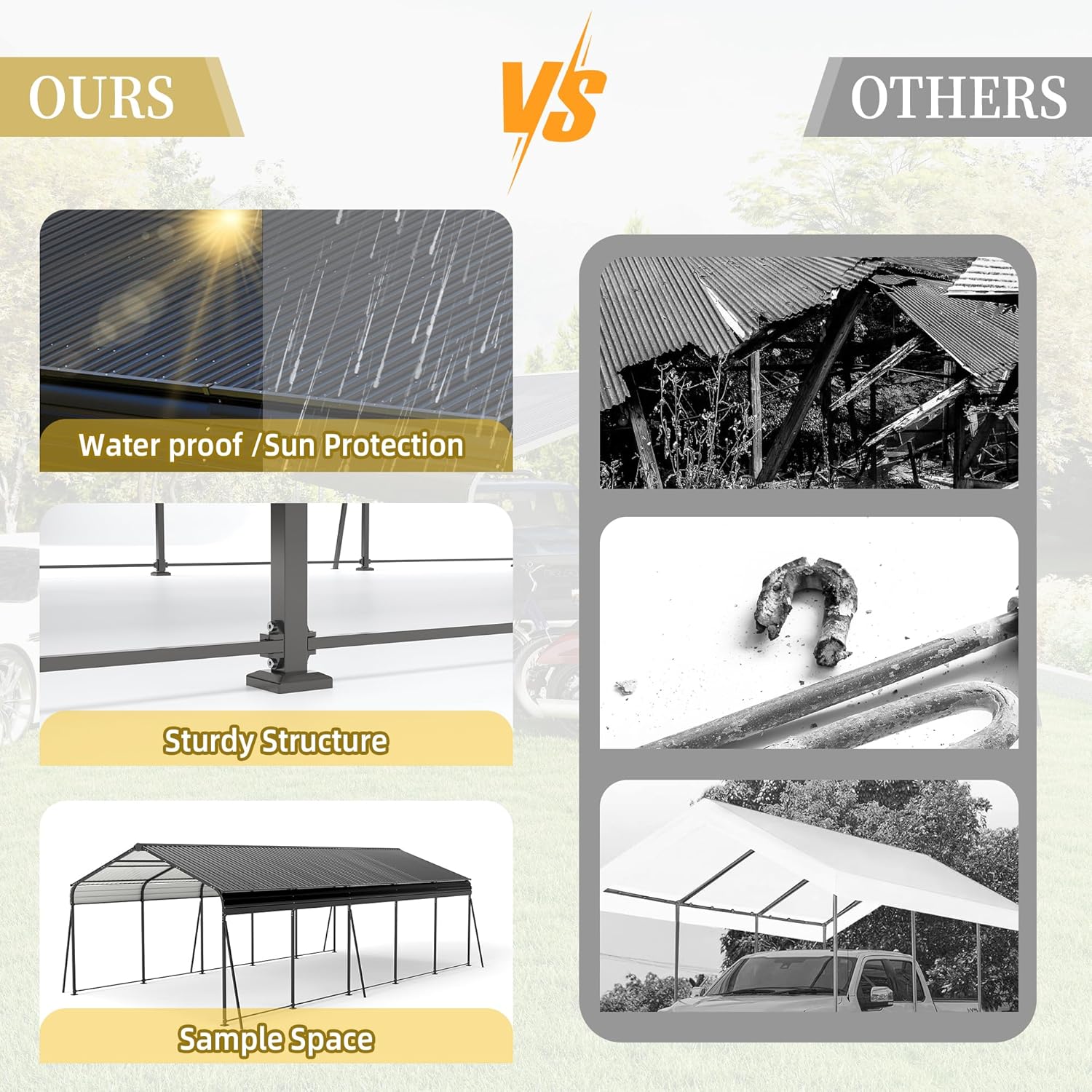 - ā šš„š„āššššš”šš« ššš«š©šØš«š: Sized at 13 Ć 26.5 ft, this metal carport provides year-round protection for your car, boat, and outdoor gear against wind, rain, and snow. Protruding eaves combined with rainproof tape seal out leaks during heavy downpours. Say goodbye to parking headaches under reliable, all-season heavy duty car ports.