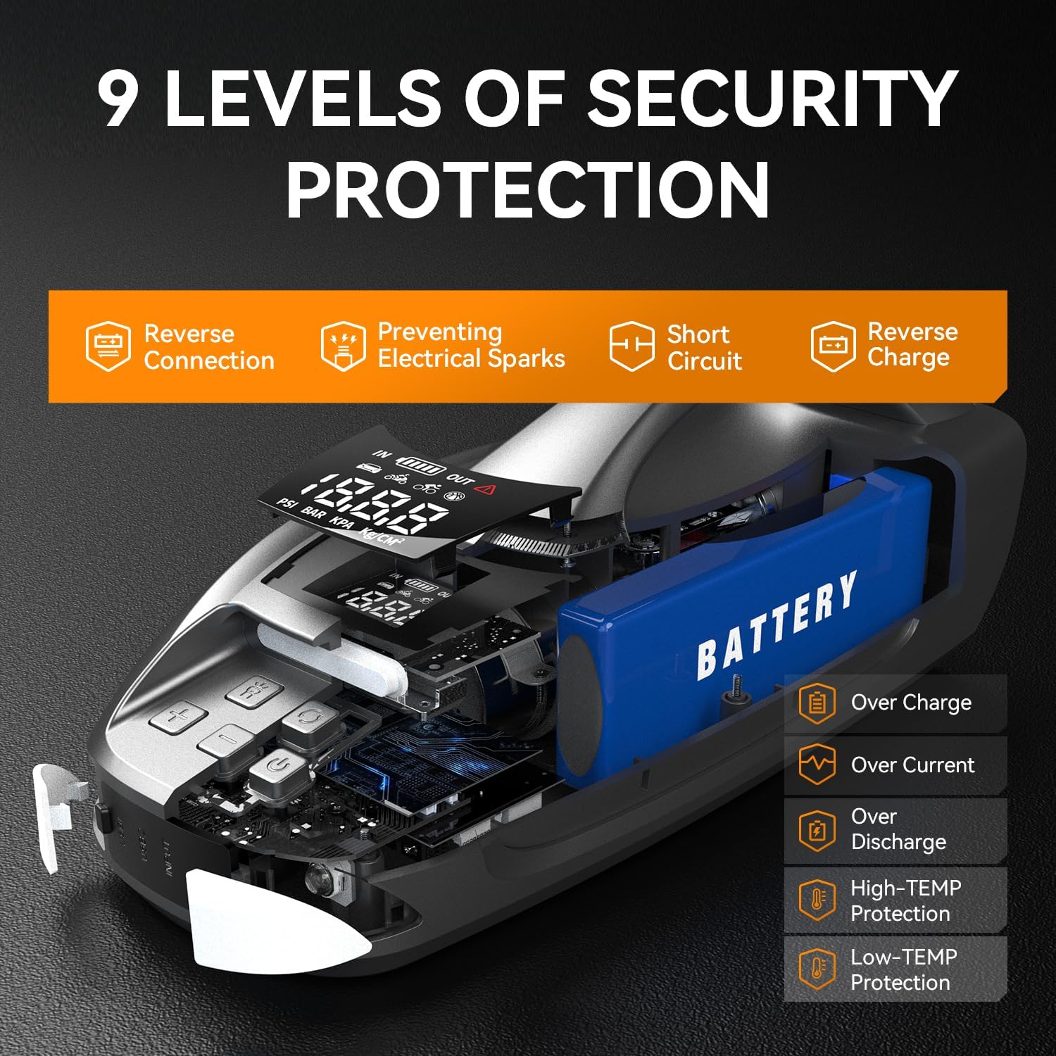 - 【9-Layer Safety Protection】Equipped with a sturdy handle, anti-glare LCD screen, non-slip base, oversized clamps, dual cable slots, and thickened wires—everything is engineered for safe, rugged use. Built-in protection guards against short circuits, overcurrent, reverse polarity, overload, overcharge, overheating, freezing, back-charging, and sparks. Built for the unexpected.