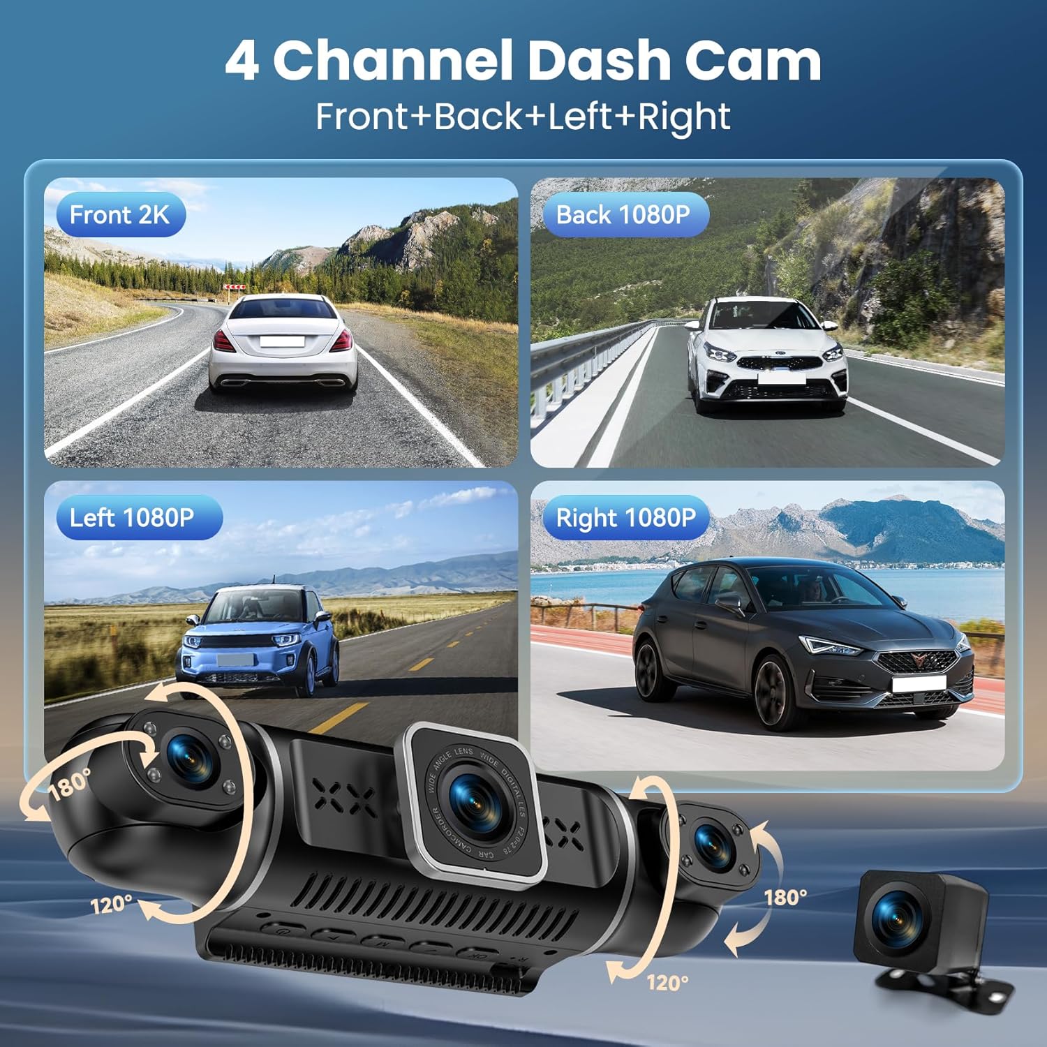 360°View 4 Channel Dash Cam, 2K+1080P Front and Rear Inside Left Right, Wireless Dash Camera for Cars, Built-in G-Sensor, IR Night Vision, 24H Parking Mode, 64GB SD Card, Loop Recording, APP Control