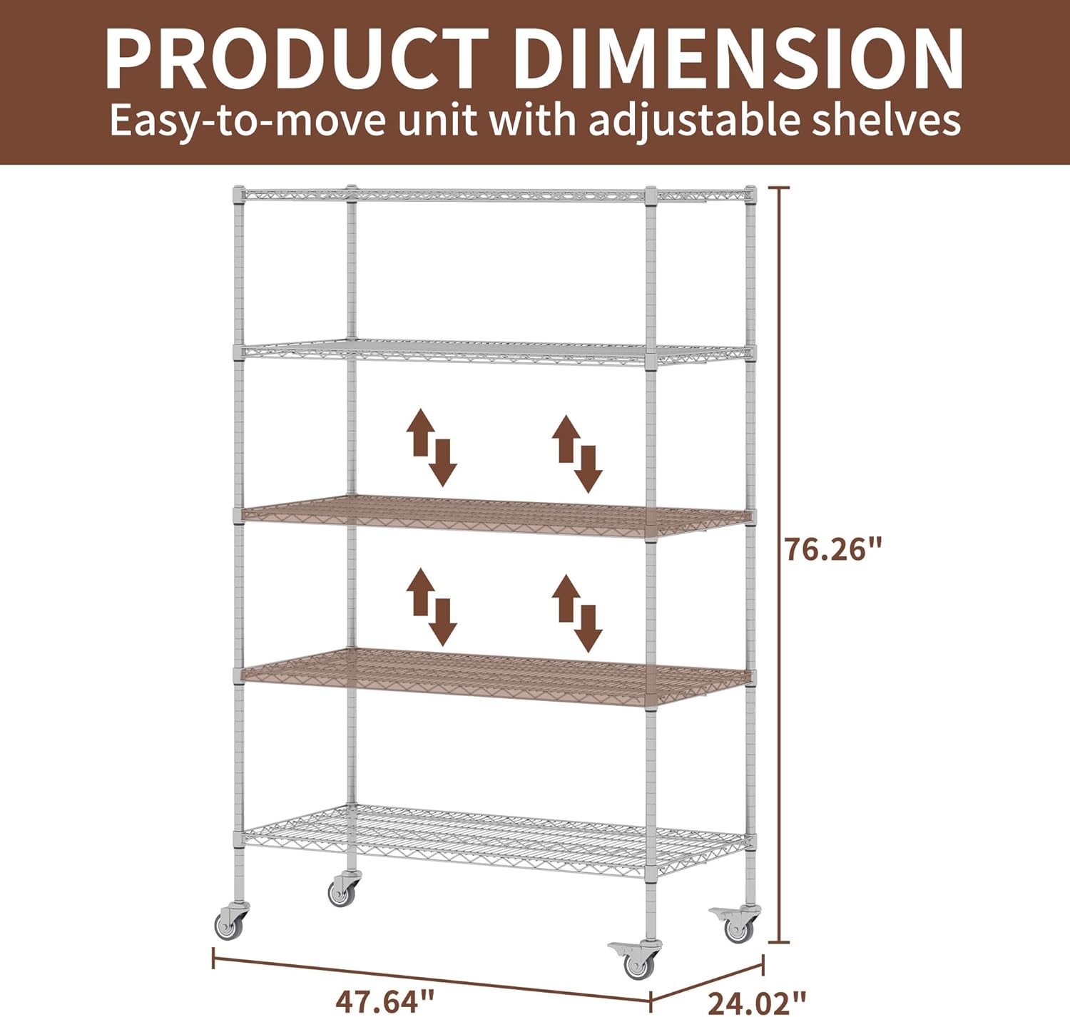 5-Tier Metal Storage Shelving Unit, Adjustable Storage Rack Display Shelves, Industrial Steel Wire Shelf on Wheels, Commercial and Home Use, 48”W x 24”D x 72”H, 1500 LBS Capacity