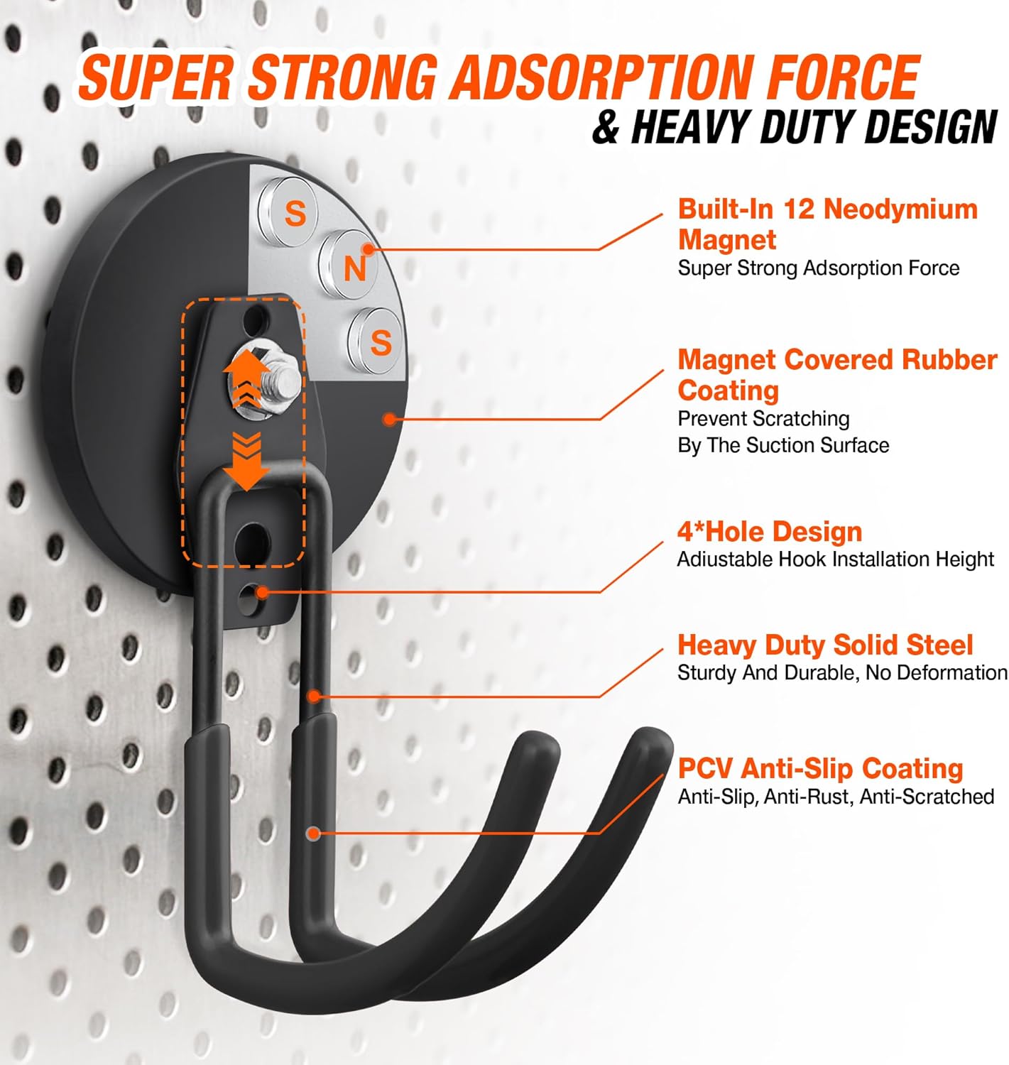 - š§²[High Quality] The garage hooks with magnets are made of heavy duty steel metal material (we are increased the length of the hook), have strong load bearing capacity. Solid steel body adopts anti-rust coating and non-slip PVC sheath which gives better grab on hanging items and prevent them from falling or being scratched. The tubular double hooks design makes the heavy duty magnetic utility hooks more stable than regular single hooks
