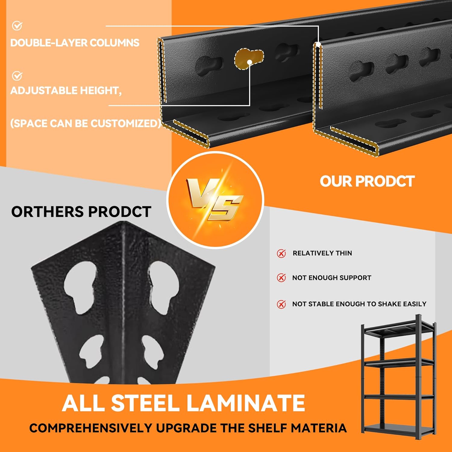 - 【UPGRADED SAFETY PROTECTION】Each shelf of our garage shelving is equipped with specially designed fall prevention safety rails, which effectively prevents items from accidentally falling and greatly reduces the chance of items tipping over and rolling to the ground in busy places such as garages and workshops where items are prone to collisions or bumps. Meanwhile, garage shelving adopts upgraded double-layer columns, which significantly improves stability and load-bearing capacity.