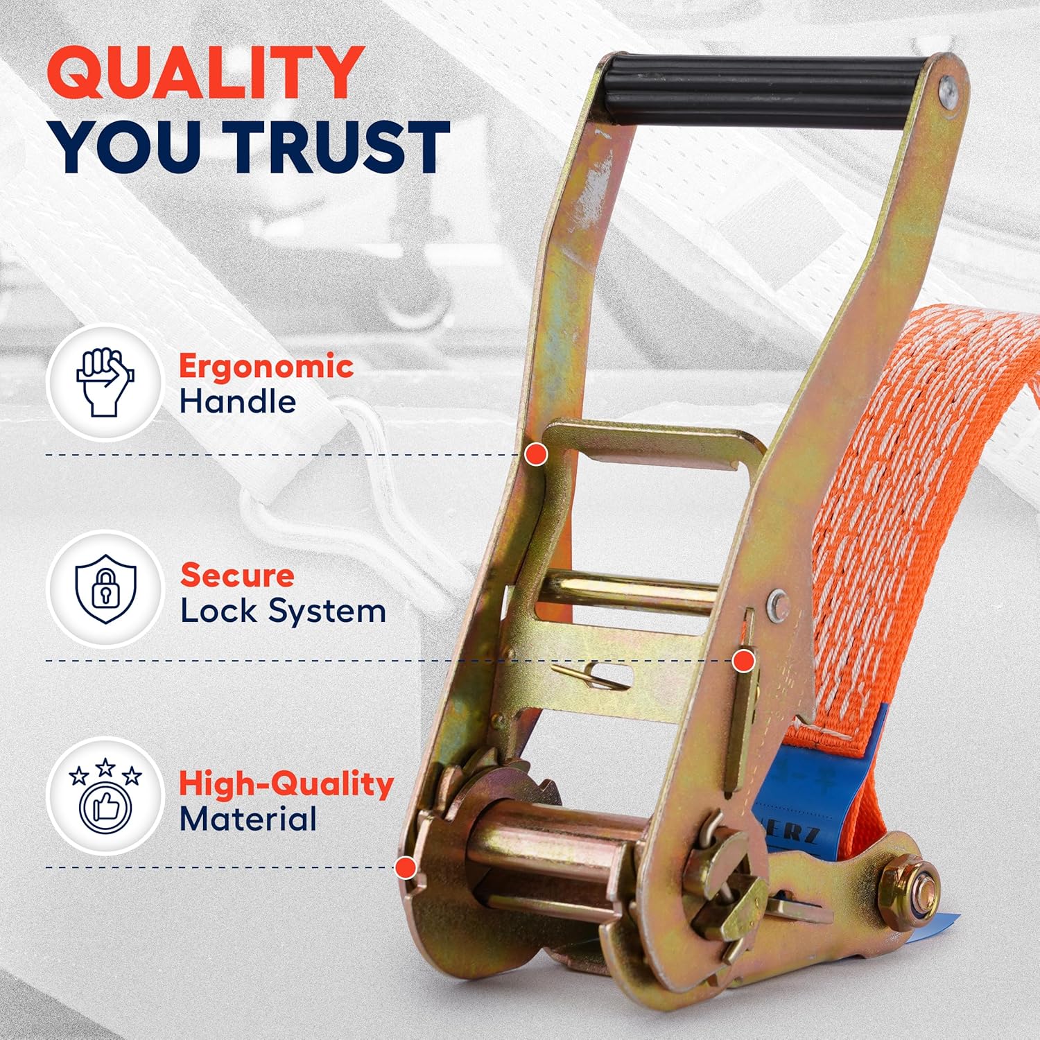 - Smooth Ratchet Mechanism – Allows controlled tensioning; prevents load shift during transit or storage