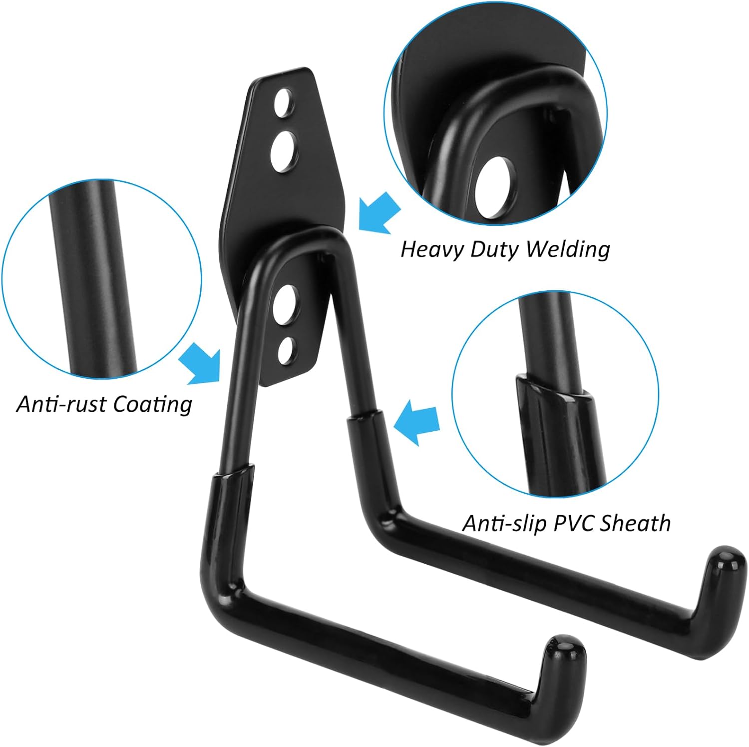 - High-Quality Materials: Suprom garage storage hooks are made of high-quality and sturdy alloy steel, have strong load bearing capacity. The whole hook surface is evenly coated with an anti-rust coating. In addition, the U-shaped hook part also wrapped with an additional layer of PVC anti-slip sheath which gives better grab on hanging items and prevent the anti-rust coating on the hook surface from being scratched.