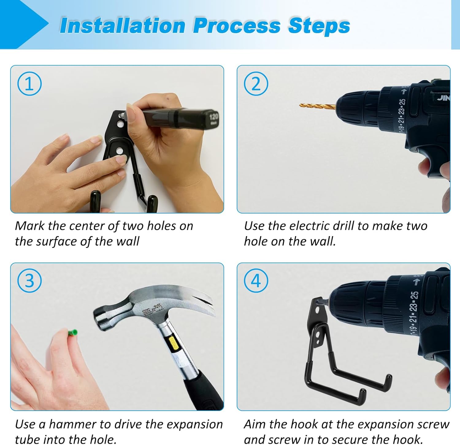 - Easy Installation: Place the garage storage hook on the wall where you want to install, mark the screw holes for the hook with a marker, select the correct anchor bolt and install it in the marked screw holes, then fix the hook to the wall. The entire installation process requires an electric drill, screwdriver and hammer.