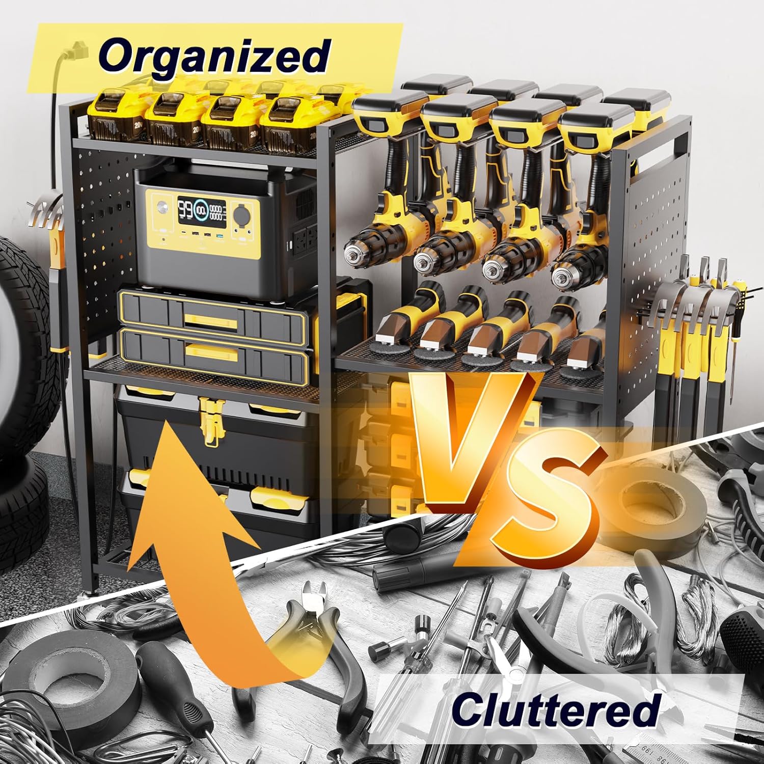 - MAXIMIZED & VERSATILE STORAGE: Tame the tool chaos! This wheeled power tool storage cart features an enlarged and elevated design (16.5 inches Γ 12.4 inches Γ 7.3 inches), offering 2-3 times more storage capacity than standard racks.Features 6 tiers, 14 fixed hooks, and 4 removable side hooks to hold drills, tools, batteries, and accessories β keeping everything visible and within reach.