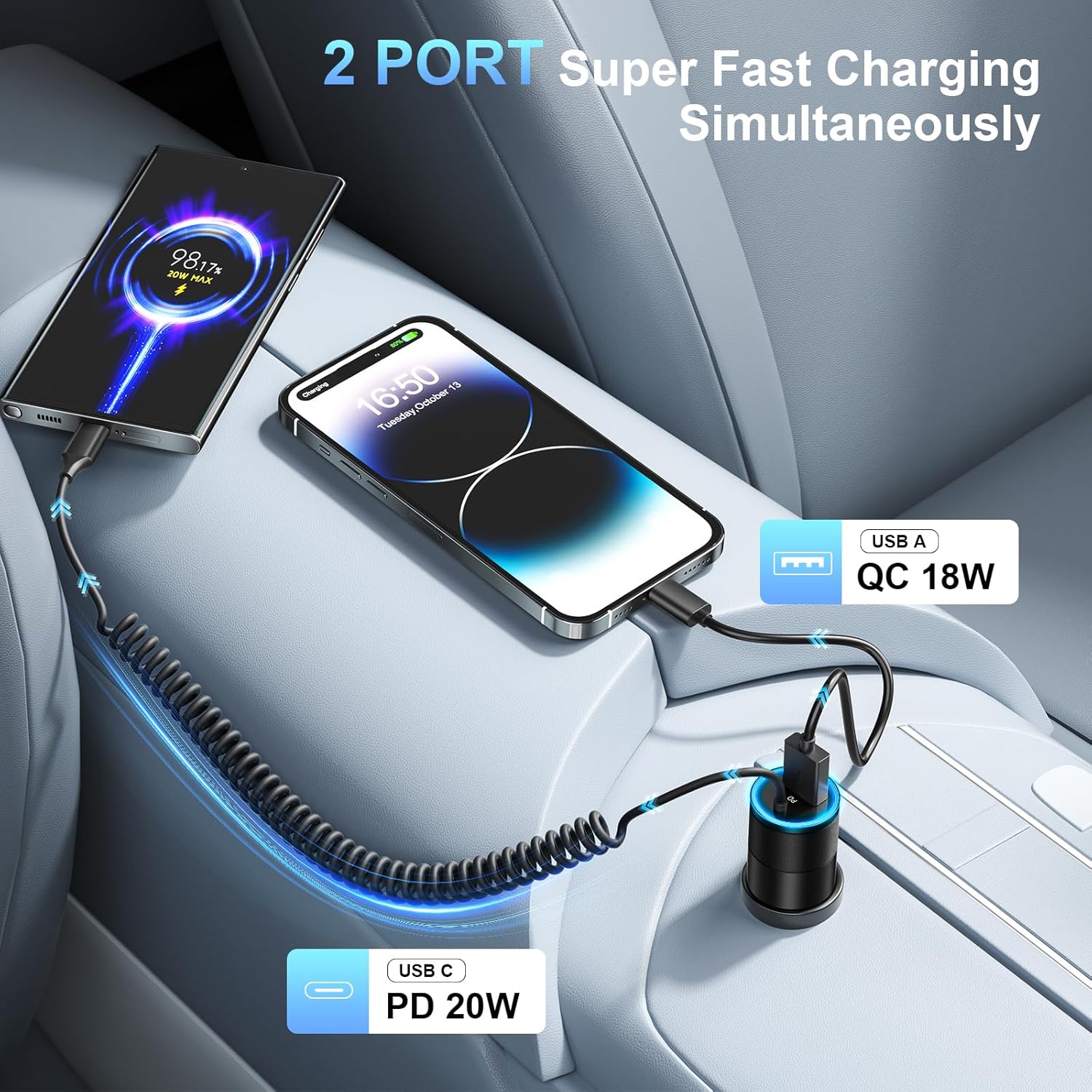 - [Super Charge On The Road] USB C car charger fast charging has both a USB A๏ผQC 3.0-18W) port and a TYPE C(PD 3.0-20W) coiled cable.The cable enables iPhone 16 to charge from 0 to 60% within 30 minutes. When you use both the USB A port and the USB C cable simultaneously, it can also meet the fast charging requirements of two devices.